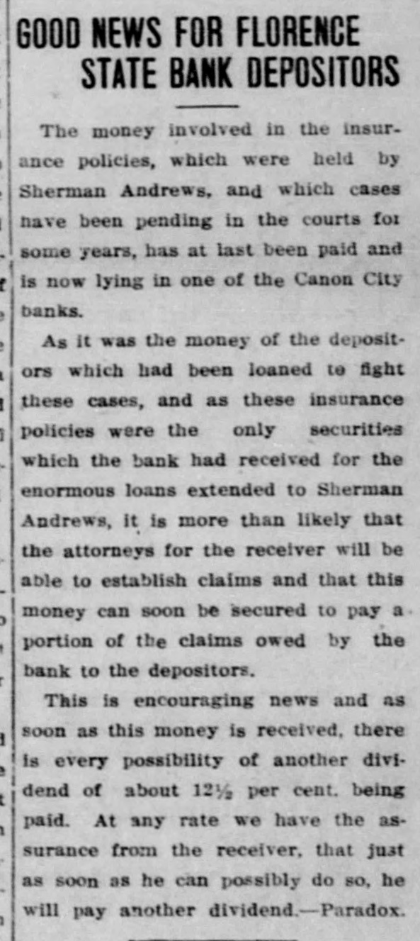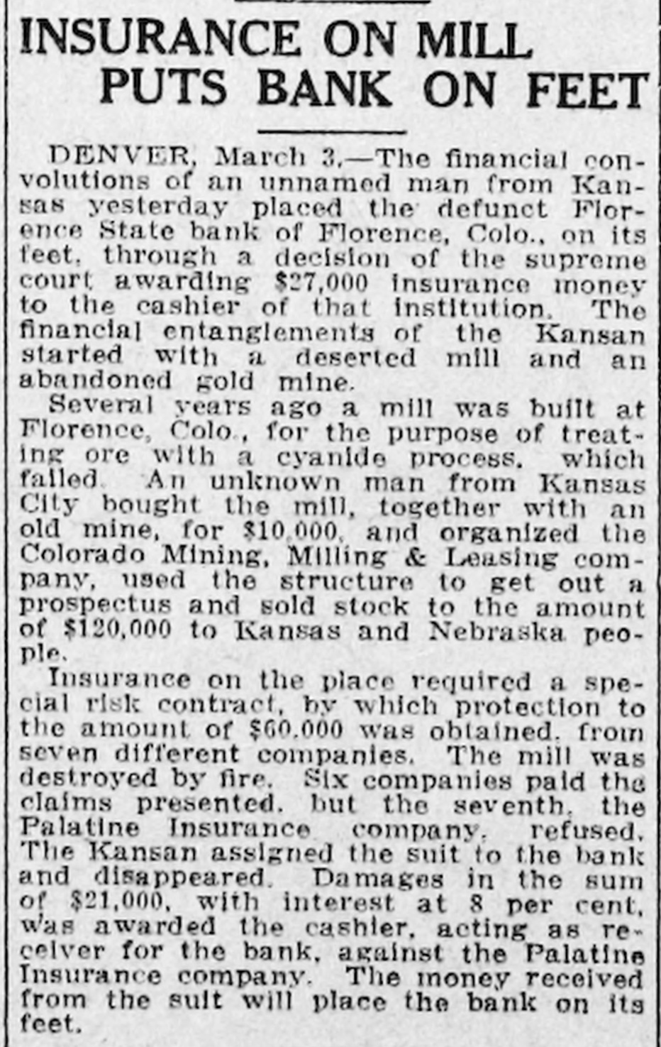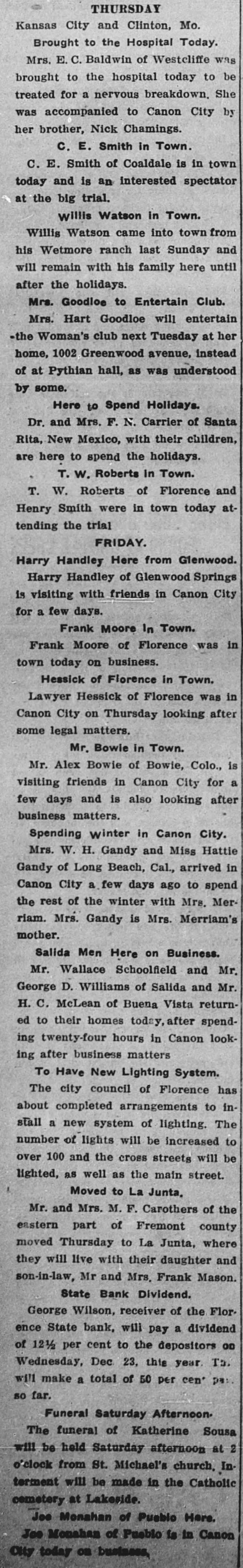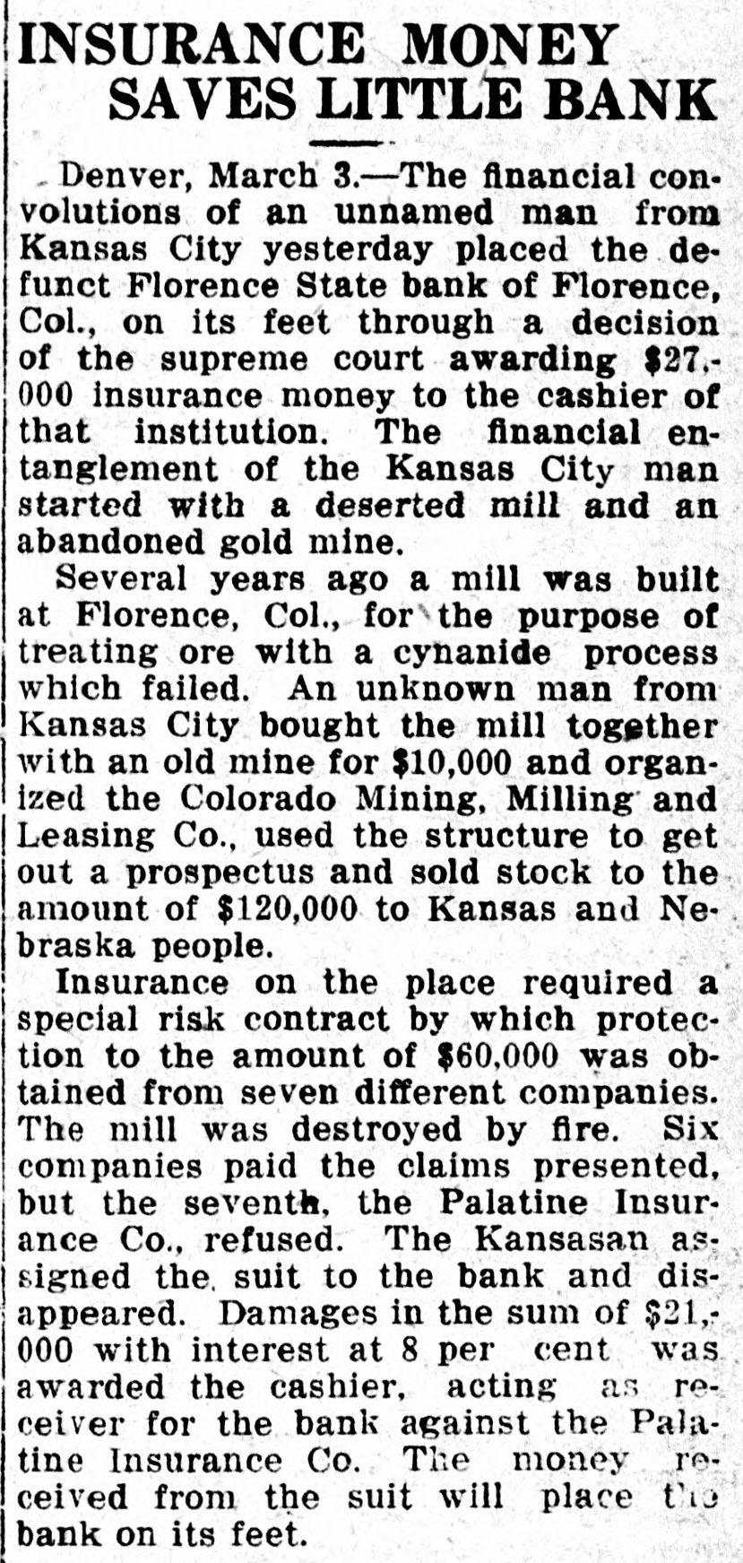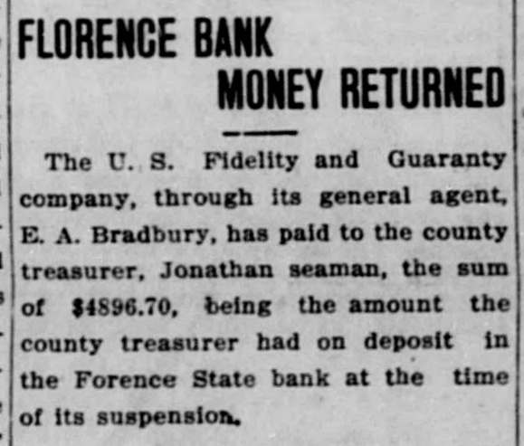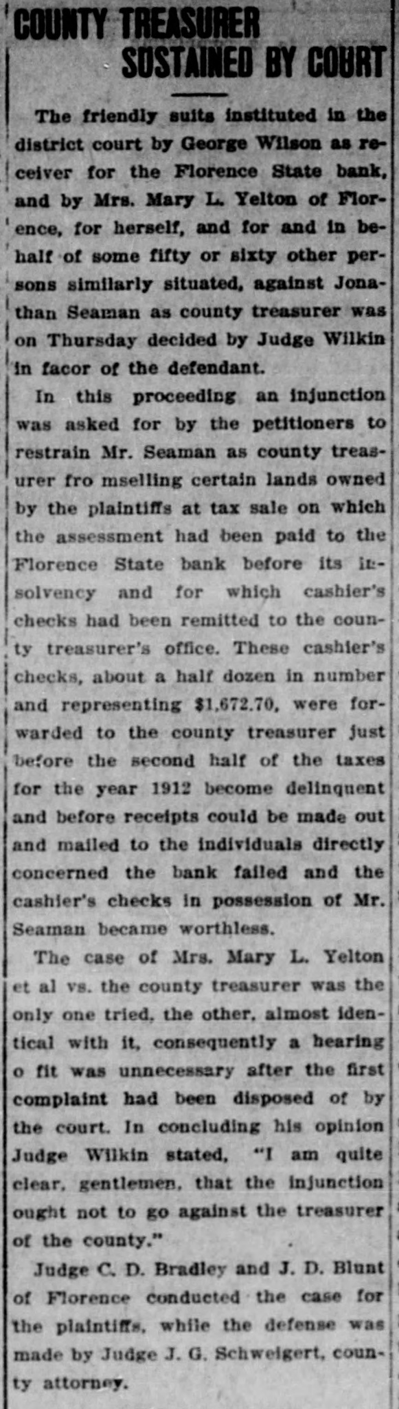 SUIT INVOLVING SALE OF BANK STOCK FILED John C. Bundy, by his attorney, Geo. H. Wilkes of Florence, and Jos. H. Maupin, filed suit in the district court here on Tuesday against Newton Large, Elizabeth B. Large, Samuel S. Large, Anna L. McCulloch, Richard S. Large, Amy Large and George Wilson, as the receiver of the Florence State bank. 5: F As appears from the petition, the suit is brought by Mr. Bundy to set aside and hold for naught a certain sale of fifty shares of the capital stock by Mr. Large for himself and on be1 half of the heirs of Samuel P. Large, deceased, to Mr. Bundy on January / 21st, last, for the price of $5,000 in cash. 1 1 The sale is sought to be set aside, e and judgment procured against the defendants for the repayment of said : $5,000 by reason of the fact, as it is 1 alleged, that the said sale was brought about by false and fraudulent repret sentations and statements made by Mr. Large to Mr. Bundy to induce him, and which did induce him, to purchase the stock. Among the frauds set out in the petition it appears that Mr. Large falsely represented the condition of the bank as to its stock, and also represented that he had authority to sell the fifty shares attempted to be sold, the same being a part of the stock held by Samuel P. Large, deceased, during his lifetime. But, as it is alleged, Samuel P. Large died October 31st, last, leaving debts unpaid, among them a large indebtedness to the Florence State bank, and as it appears, the debts of the estate were not paid and no administration was had and there was no authority of law for the sale of the stock. The petition prays, also, that immediately upon the rendition of judgment that Newton Large, his mother, $ e Elizabeth B. Large, Samuel S. Large, I Anna L. McCulloch, Richard S. Large I and Amy Large, heirs-at-law of the estate of Samuel P. Large, deceased, 1 each and all of them be committed to ( 8 the county jail for the period of one o year, upon their failure to pay or respond to the judgment of the court immediately.