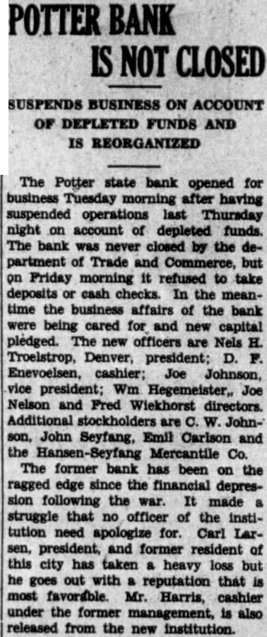 The Potter State bank at Potter, which was taken over by the banking department recently, was reopened last week as new concern after had been successfuly refinanced. Depositors will not lose anything, it believed, the only losses being to the stockholders the former W. Johnson, state senator of Potter stockholder in the new bank.