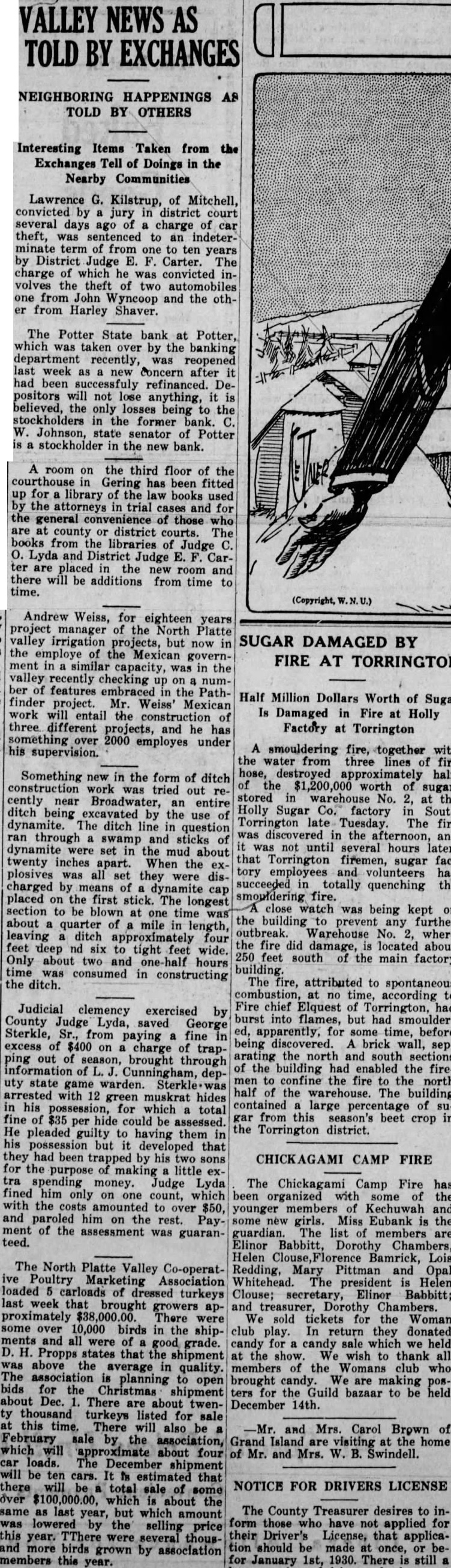 The North Platte Valley Co-operatRedding, Mary Pittman and Opal ive Poultry Marketing Association Whitehead. The president Helen loaded carloads of dressed turkeys Clouse; secretary, Elinor Babbitt; last week that brought growers ap- and treasurer, Dorothy Chambers. proximately There were We sold tickets for the Woman some over 10,000 birds in the ship- club play. In return they donated ments and all were of good grade. candy for candy sale which we held H. Propps states that the shipment the show. We wish to thank all members of the Womans club who The above the average quality. association to planning open brought candy. We are making bids for the Christmas shipment ters for the Guild bazaar to be held about Dec. There are about twenDecember 14th. thousand turkeys listed for sale this time. There will also and Mrs. Carol Brown of February sale by the association, Grand Island are visiting at the home which will approximate about four Mr. and Mrs. Swindell. loads. The December shipment be ten cars. It In estimated that there will NOTICE FOR DRIVERS LICENSE total sale of some over which about the same as last year, but which amount The County Treasurer desires to was lowered the form those who have not applied for selling price this TThere their Driver's License, that applicayear. were several thousand more birds grown by association tion should made once, or members this for January 1st, 1930. There still year.