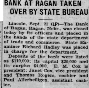 BANK AT RAGAN TAKEN OVER BY STATE BUREAU Lincoln, Sept. 21 Bank of Ragan, Ragan Nebr., was closed today by its officers and placed in the hands of the state department of trade and commerce. State Examiner Richard Hadley was placed in charge for the department. Deposits of the bank were listed $110,000; its capital $20,000 and its surplus E. Cox president; Janet Cox, vice president and Thomas Rogers, cashier and Paul Allerheiligen, assistant cashier.