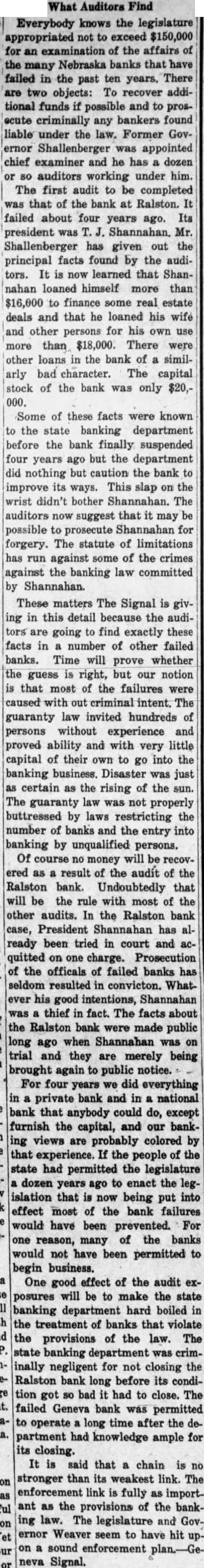 What Auditors Find Everybody knows the legislature appropriated not to exceed $150,000 for an examination of the affairs of the many Nebraska banks that have failed in the past ten years, There are two objects: To recover additional funds if possible and to prosecute criminally any bankers found liable under the law. Former Governor Shallenberger was appointed chief examiner and he has a dozen or 80 auditors working under him. The first audit to be completed was that of the bank at Ralston. It failed about four years ago. Its president was T. J. Shannahan. Mr. Shallenberger has given out the principal facts found by the auditors. It is now learned that Shannahan loaned himself more than $16,000 to finance some real estate deals and that he loaned his wife and other persons for his own use more than $18,000. There were other loans in the bank of a similarly bad character. The capital stock of the bank was only $20,000. Some of these facts were known to the state banking department before the bank finally suspended four years ago but the department did nothing but caution the bank to improve its ways. This slap on the wrist didn't bother Shannahan. The auditors now suggest that it may be possible to prosecute Shannahan for forgery. The statute of limitations has run against some of the crimes against the banking law committed by Shannahan. These matters The Signal is giving in this detail because the auditors are going to find exactly these facts in a number of other failed banks. Time will prove whether the guess is right, but our notion is that most of the failures were caused with out criminal intent. The guaranty law invited hundreds of persons without experience and proved ability and with very little capital of their own to go into the banking business. Disaster was just as certain as the rising of the sun. The guaranty law was not properly buttressed by laws restricting the number of banks and the entry into banking by unqualified persons. Of course no money will be recovered as a result of the audit of the Ralston bank. Undoubtedly that will be the rule with most of the other audits. In the Ralston bank case, President Shannahan has already been tried in court and acquitted on one charge. Prosecution of the officals of failed banks has seldom resulted in convicton. Whatever his good intentions, Shannahan was a thief in fact. The facts about the Ralston bank were made public long ago when Shannahan was on trial and they are merely being brought again to public notice. For four years we did everything in a private bank and in a national bank that anybody could do, except furnish the capital, and our banking views are probably colored by that experience. If the people of the state had permitted the legislature dozen years ago to enact the legislation that is now being put into effect most of the bank failures would have been prevented. For one reason, many of the banks would not have been permitted to begin business. One good effect of the audit exposures will be to make the state banking department hard boiled in the treatment of banks that violate the provisions of the law. The state banking department was criminally negligent for not closing the Ralston bank long before its condition got so bad it had to close. The failed Geneva bank was permitted to operate long time after the department had knowledge ample for its closing. It is said that a chain is no stronger than its weakest link. The enforcement link is fully as important as the provisions of the banking law. The legislature and Governor Weaver seem to have hit upon a sound enforcement plan-Geneva Signal.