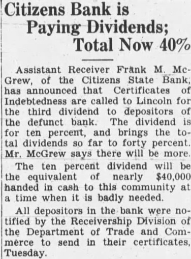 Citizens Bank is Paying Dividends; Total Now Assistant Receiver Frank M McGrew, of the Citizens State Bank, has that Certificates of called to Lincoln the third dividend to depositors of the defunct bank. The dividend for ten percent, and brings the dividends far to forty percent. McGrew there will be more says The ten percent dividend will the equivalent nearly $40,000 handed in cash to this community time when it is badly needed. All depositors in the bank were notified by the Division of the Department of Trade and Commerce send in their certificates, Tuesday.
