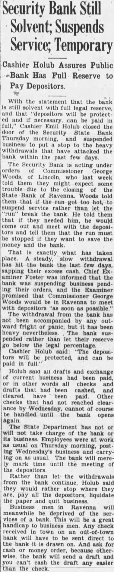 Security Suspends Temporary Cashier Holub Assures Public Has Full Reserve to Pay Depositors. With the statement that the bank still with full legal reserve, and that 'depositors will protectand can be in paid Cashier Emil Holub closed the Security State Bank Thursday morning, and suspended business put stop to the heavy withdrawals that have attacked the bank within the past few days. The Security Bank acting under orders George Woods, of Lincoln, who last week told them they might expect some to the closing of the State Bank Ravenna. Woods told them that the run too hot, suspend rather than let the break the bank. He told them that they needed him. he would come out and meet with the deposiand tell them that the run must be stopped if they want to save the money the bank. That is exactly what has taken place. steady, slow withdrawal has hit the bank the last few days, sapping their excess cash Chief Ex. aminer Foster was that the bank was suspending pendtheir orders, and the Examiner that Commissioner George Woods would Ravenna to meet depositors soon as possible. withdrawal from the bank has been accompanied by any outfright or panic, but has been heavy The bank suspended rather than let their reserve below legal percentage. Cashier Holub said: depositors will be protected, and can be paid in Holub said all drafts and exchange business had been paid, or in other words all checks and drafts that had been cleared, have been Other checks that had not reached clearance by Wednesday, cannot course be handled until the bank opens again. The State Department has not or will not take charge of the bank its business. Employees were at work usual on Thursday morning, posting Wednesday's business carrying on as usual. The bank will meremark time until the meeting of the depositors Rather than let the withdrawals from the bank Holub said they would rather stop where they are, pay all the depositors, liquidate the paper and quit business. Business men in Ravenna will meanwhile of the services of bank. This will great handicap business men. Any check received town an out-of-town bank will have to be sent direct to the bank drawn And ask for cash money order, because otherwise, the bank will send draft and you can't cash the draft any easier than the check.