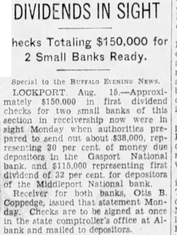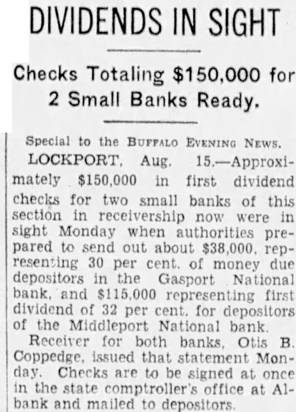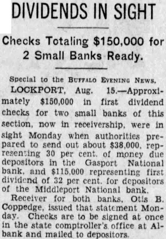 Special to the BUFFALO EVENING NEWS. LOCKPORT Aug 15.-Approximately $150,000 in first dividend checks for two small banks of sight resenting 30 per money due depositors the Gasport bank. and representing first dividend 32 per for of the Middleport National bank Receiver for banks B that statement Monsigned the at Albank and mailed to depositors