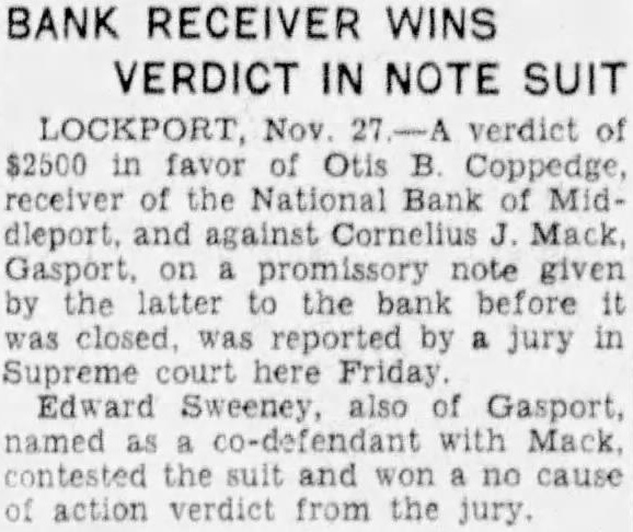LOCKPORT Nov verdict of $2500 favor Otis B. Coppedge, receiver of the National Bank of Middieport, and against Cornelius J. Mack, Gasport, on promissory note given by latter to the before was reported by jury in here Edward Sweeney, Gasport, named with Mack contested the suit and won no of action verdict from the