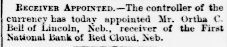 RECEIVER APPOINTED.-The controller of the currency has today appointed Mr. Ortha C. Bell of Lincoln, Neb., receiver of the First National Bank of Red Cloud. Neb.