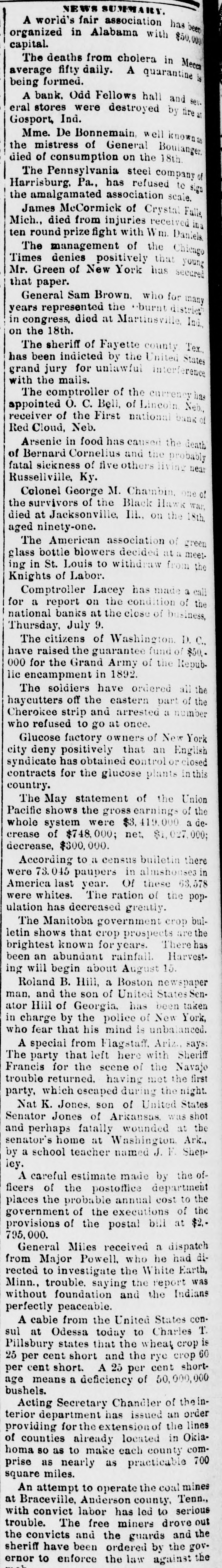 ANVEROS SMEK A world's fair association has capital. organized in Alabama with been $50,000 The deaths from cholera in Mecca *! V dilly. My average being formed. A bank. Odd Fellows hall and sev. eral stores were destroyed by fire Gosport, Ind. Mme. De Bonnemain well knownas the mistress of General Boulanger. died of consumption on the 18th. The Pennsylvania steel company of Harrisburg. Pa., has refused to sign the amalgamated association scale. James McCormick of Crystal Fulls, Mich., died from injuries received ina ten round prize fight with Wm. Daniels The management of the Chicago Times denies positively that young Mr. Green of New York has secured that paper. General Sam Brown. who for many years represented the burnt district in congress, died at Martinsville, Ind., on the 18th. The sheriff of Fayette county Tex., has been indicted by the United States grand jury for unlawful interference with the mails. The comptroller of the currency has appointed O. C. Bell, of Lincoln Neb., receiver of the First national bank of Red Cloud, Neb. Arsenic in food has caused the death of Bernard Cornelius and the probably fatal sickness of five others living near .sy Colonel George M. Chambin. one of the survivors of the Black Hawk war, 4181 eq: no "III 10 perp pesu The American association of green Meam 11 11: peppep onitie Stass out mony 01 7S u! Sui Knights of Labor. Comptroller Lacey has made a call for a report on the condition of the national banks at the close of business, Thursday, July 9. The citizens of Washington D. C., have raised the guarantee fund of $50.-qndey am 10 Amay Grand the JOJ 000 lic encampment in 1892. The soldiers have ordered all the haycutters off the eastern part of the Cherokee strip and arrested a number who refused to go at once. Glucose factory owners of New York city deny positively that an English syndicate has obtained control or closed contracts for the glucose plants in this country. The May statement of the Union Pacific shows the gross earnings of the whole system were $3,419,000 a decrease of $748,000; net, $1,027,000; decrease, $300,000. According to a census bulletin there were 73.045 paupers in almshouses in America last year. Of these 63,578 were whites. The ration of the population has decreased greatly. The Manitoba government crop bulletin shows that crop prospects the brightest known for years. Therehas been an abundant rainfall. Harvesting will begin about August 15. Roland B. Hill, a Boston newspaper man, and the son of United StatesSenator Hill of Georgia, has been taken in charge by the police of New York, who fear that his mind is unbalanced. A special from Flagstaff. Ariz., says: The party that left here with Sheriff Francis for the scene of the Navajo trouble returned. having met the first party, which escaped during the night. Nat K. Jones. son of United States Senator Jones of Arkansas was shot and perhaps fatally wounded at the senator's home at Washington Ark., State A 'f' рашей school E &q ley. A careful estimate made by the officers of the postoffice department places the probable annual cost to the