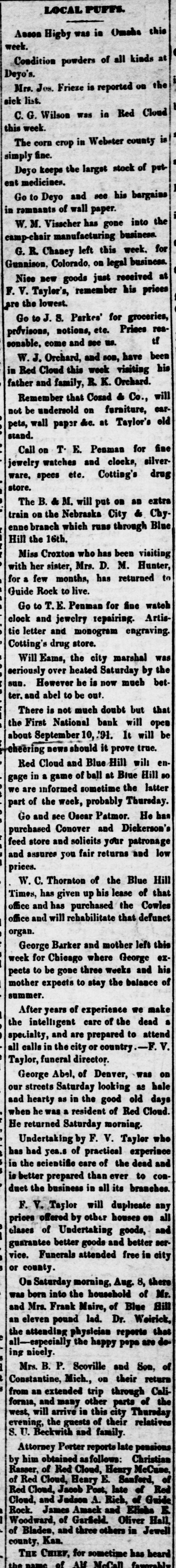 LOCAL PUFFS. Asson Higby was is Omaha this week. Condition powders of all kinds at Deyo's. i Mrs. Jos. Frieze is reported on the sick list. I C. G. Wilson was in Red Cloud this week. The corn crop in Webster county is simply fine. Deso keeps the larget stock of petent medicines. I Go to Deyo and see his bargains in remunts of wall paper. il W. M. Visscher has gone into the camp-chair manufacturing business. G. R. Chaney left this week. for Gunnison, Colorado, on legal business. Nice new goods just received at F. V. Taylor's, remember his prices are the lowest. Go to J. S. Parkes' for groceries, prôvisons, notions, etc. Prices reaif sonable, come and see us. W. J. Orchard, and son, have been in Red Cloud this week visiting his father and family, R. K. Orchard. Remember that Cosad & Co., will not be undersold on furniture, carpets, wall paper &c. at Taylor's old stand. Call on T. E. Penman for fine jewelry watches and clocks, silverware, spees etc. Cotting's drug store. The B. & M. will put on an extra train on the Nebraska City & Chyenne branch which runs through Blue Hill the 16th. Miss Croxton who has been visiting with her sister, Mrs. D. M. Hunter, for a few months, has returned to Guide Rock to live. Go to T.E. Penman for fine watch clock and jewelry repairing. Artistie letter and monogram engraving. Cotting's drug store. Will Eams, the city marshal was seriously over heated Saturday by the sun. However be is now much better. and abel to be out. There is not much doubt but that the First National bank will open about September 10, '91. It will be cheering news should it prove true. Red Cloud and Blue Hill will engage in a game of ball at Blue Hill so we are informed sometime the latter part of the week, probably Thursday. Go and see Oscar Patmor. He has purchased Conover and Dickerson's feed store and solicits your patronage and assures you fair returns and low prices. W. C. Thornton of the Blue Hill Times, has given up his lease of that office and has purchased the Cowles office and will rehabilitate that defunct organ. George Barker and mother left this week for Chicago where George expects to be gone three weeks and his mother expects to stay the balance of summer. After years of experience we make the intelligent care of the dead a specialty, and are prepared to attend all calls in the city or country -F. V. Taylor, funeral director. George Abel, of Denver, was on our streets Saturday looking as hale and hearty as in the good old days when he was a resident of Red Cloud. He returned Saturday morning. Undertaking by F. V. Taylor who has had yea.s of practical experince in the scientific care of the dead and is better prepared than ever to comduet the business in all its branches. F. V. Taylor will duplicate any prices offered by other houses on all clases of Undertaking goods, and guarantee better goods and better service. Funerals attended free in city or county. On Saturday morning, Aug. 8, there was born into the household of Mr. and Mrs. Frank Maire, of Blue Hill an eleven pound lad. Dr. Weirick, the attending physician reports that all-especially the happy pops are doing nicely. Mrs. B. P. Scoville and Son, of Constantine, Mich., on their return from an extended trip through California, and many other parts of the west, will arrive is this city Thursday evening, the guests of their relatives S. U. Beckwith and family. Attorney Porter reports late pensions by him obtained asfollows: Christian Rasser, of Red Cloud, Henry McCuse, of Red Cloud, Heary E. Sanford, of Red Cloud, Jacob Post, late of Red Cloud, and Judson A. Rich, of Guide Rock. James Amack and Elisha E Woodward, of Garfield. Oliver Hall, of Blades, and three others in Jewell county, Kan. Tur CHIPE for cometime