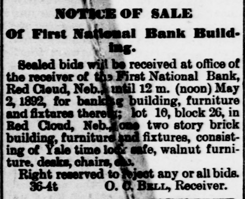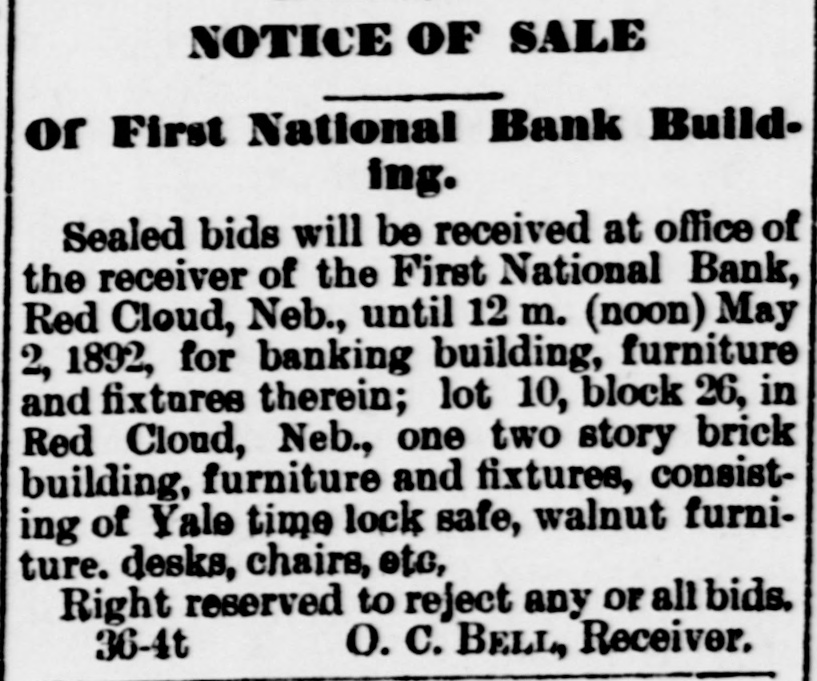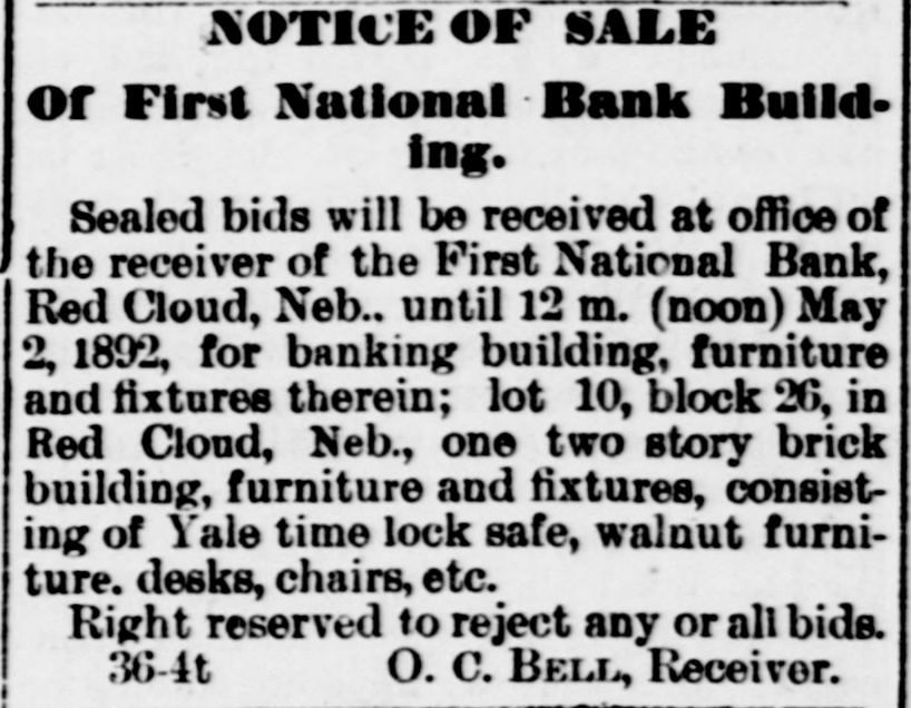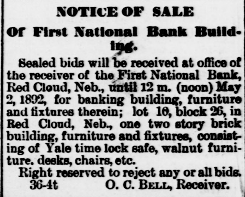 NOTICE OF SALE Of First National Bank Building. Sealed bids will be received at office of the receiver of the First National Bank, Red Cloud, Neb.. until 12 m. (noon) May 2, 1892, for banking building, furniture and fixtures therein; lot 10, block 26, in Red Cloud, Neb., one two story brick building, furniture and fixtures, consisting of Yale time lock safe, walnut furniture. desks, chairs, etc. Right reserved to reject any or all bids. 36-4t O. C. BELL, Receiver.