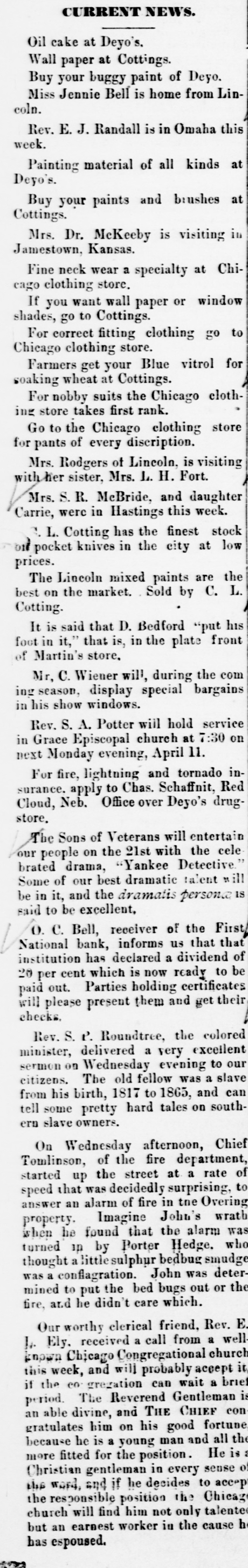 CURRENT NEWS. Oil cake at Deyo's. Wall paper at Cottings. Buy your buggy paint of Deyo. Miss Jennie Bell is home from Lincoln. Rev. E. J. Randall is in Omaha this week. Painting material of all kinds at Deyo's. Buy your paints and brushes at Cottings. Mrs. Dr. McKeeby is visiting in Jamestown, Kansas. Fine neck wear a specialty at Chicago clothing store. If you want wall paper or window shades, go to Cottings. For correct fitting clothing go to Chicago clothing store. Farmers get your Blue vitrol for soaking wheat at Cottings. For nobby suits the Chicago clothing store takes first rank. Go to the Chicago clothing store for pants of every discription. Mrs. Rodgers of Lincoln, is visiting with her sister, Mrs. L. H. Fort. Mrs. S. R. McBride, and daughter Carrie, were in Hastings this week. ! L. Cotting has the finest stock of pocket knives in the city at low prices. The Lincoln mixed paints are the best on the market. Sold by C. L. Cotting. It is said that D. Bedford "put his foot in it," that is, in the plate front of Martin's store, Mr, C. Wiener will, during the com ing season, display special bargains in his show windows. Rev. S. A. Potter will hold service in Grace Episcopal church at 7:30 on next Monday evening, April 11. For fire, lightning and tornado insurance. apply to Chas. Schaffnit, Red Cloud, Neb. Office over Deyo's drugstore. The Sons of Veterans will entertain our people on the 21st with the cele brated drama, "Yankee Detective." Some of our best dramatic talent ill be in it, and the dramatis persona IS said to be excellent. O. C. Bell, receiver of the First National bank, informs us that that institution has declared a dividend of 20 per cent which is now ready to be paid out. Parties holding certificates will please present them and get their checks. Rev. S. P. Roundtree, the colored minister, delivered a very excellent sermon on Wednesday evening to our citizens. The old fellow was a slave from his birth, 1817 to 1865, and can tell some pretty hard tales on southern slave owners. On Wednesday afternoon, Chief Tomlinson, of the fire department, started up the street at a rate of speed that was decidedly surprising, to answer an alarm of fire in the Overing property. Imagine John's wrath when he found that the alarm was turned in by Porter Hedge. who thought a little sulphur bedbug smudge was a conflagration. John was determined to put the bed bugs out or the fine and be didn't care which