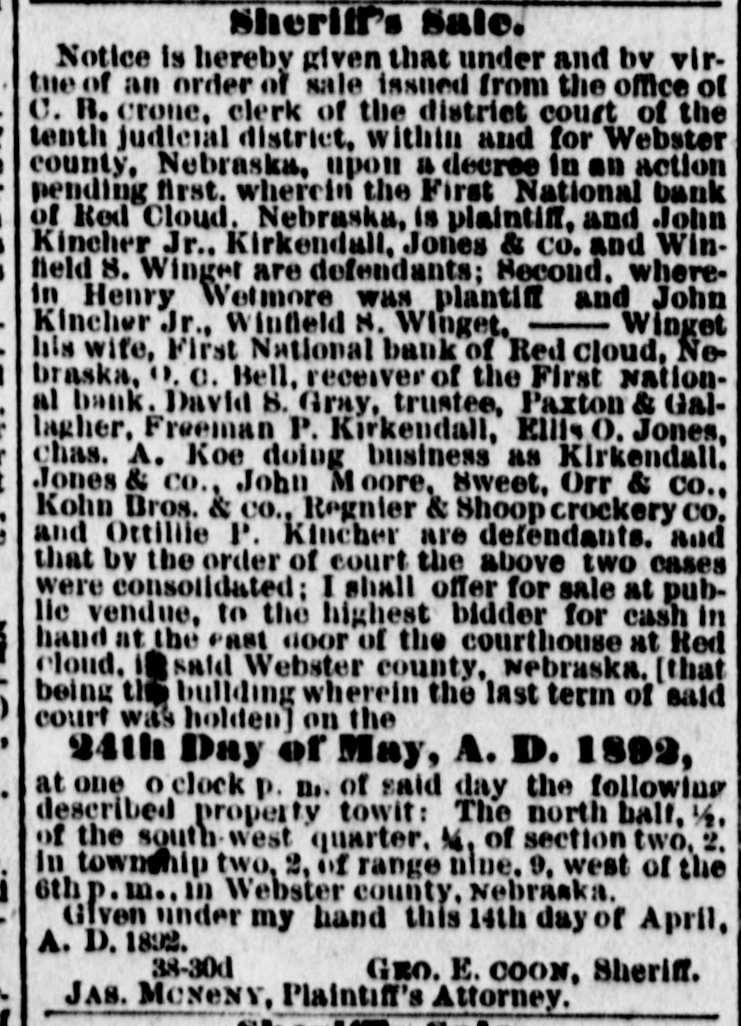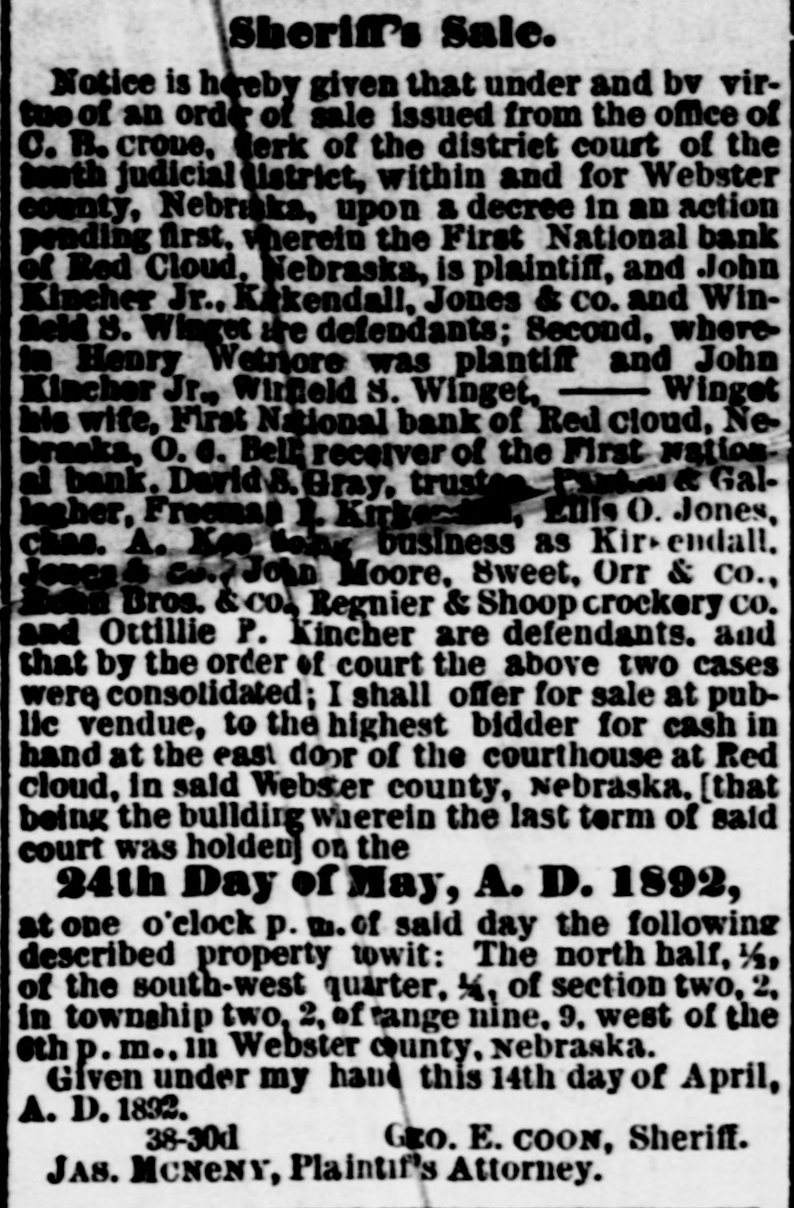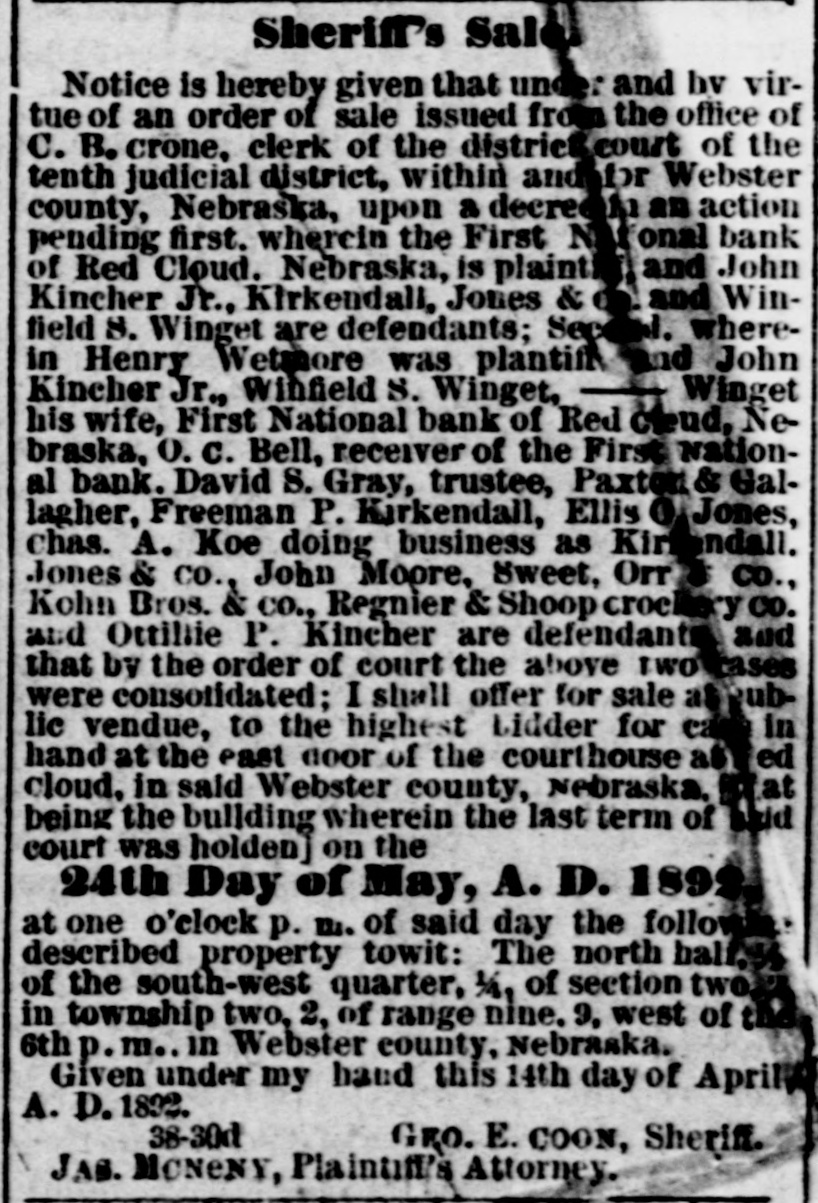 # Sheriff's Sale. Notice is hereby given that under and by virtue of an order of sale issued from the office of C. B. crone, clerk of the district court of the tenth judicial district, within and for Webster county, Nebraska, upon a decree in an action pending first, wherein the First National bank of Red Cloud, Nebraska, is plaintiff, and John Kincher Jr., Kirkendall, Jones & co. and Winfield S. Winget are defendants; Second, wherein Henry Wetmore was plantiff and John Kincher Jr., Winfield S. Winget, Winget his wife, First National bank of Red cloud, Nebraska, O. C. Bell, receiver of the First National bank. David S. Gray, trustee, Paxton & Gallagher, Freeman P. Kirkendall, Ellis O. Jones, chas. A. Koe doing business as Kirkendall. Jones & co., John Moore, sweet, Orr & co., Kohn Bros. & co., Regnier & Shoop crockery co. and Ottiliie P. Kincher are defendants, and that by the order of court the above two cases were consolidated; I shall offer for sale at public vendue, to the highest bidder for cash in hand at the east door of the courthouse at Red cloud, it said Webster county, Nebraska, [that being the building wherein the last term of said court was holden] on the 24th Day of May, A. D. 1892, at one o'clock p. m. of said day the following described property towit: The north half, ½, of the south-west quarter, ¼, of section two, 2. in township two, 2, of range nine, 9, west of the 6th p.m., in Webster county, Nebraska. Given under my hand this 14th day of April, A. D. 1892. 38-30d GEO. E. COON, Sheriff. JAS. MONENY, Plaintiff's Attorney.