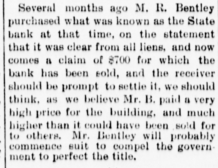 Several months ago M. R. Bentley purchased what was known as the State bank at that time, on the statement that it was clear from all liens, and now comes a claim of $700 for which the bank has been sold, and the receiver should be prompt to settle it, we should think, as we believe Mr. B. paid a very high price for the building, and much higher than it could have been sold for to others. Mr. Bentley will probably commence suit to compel the government to perfect the title.