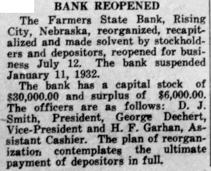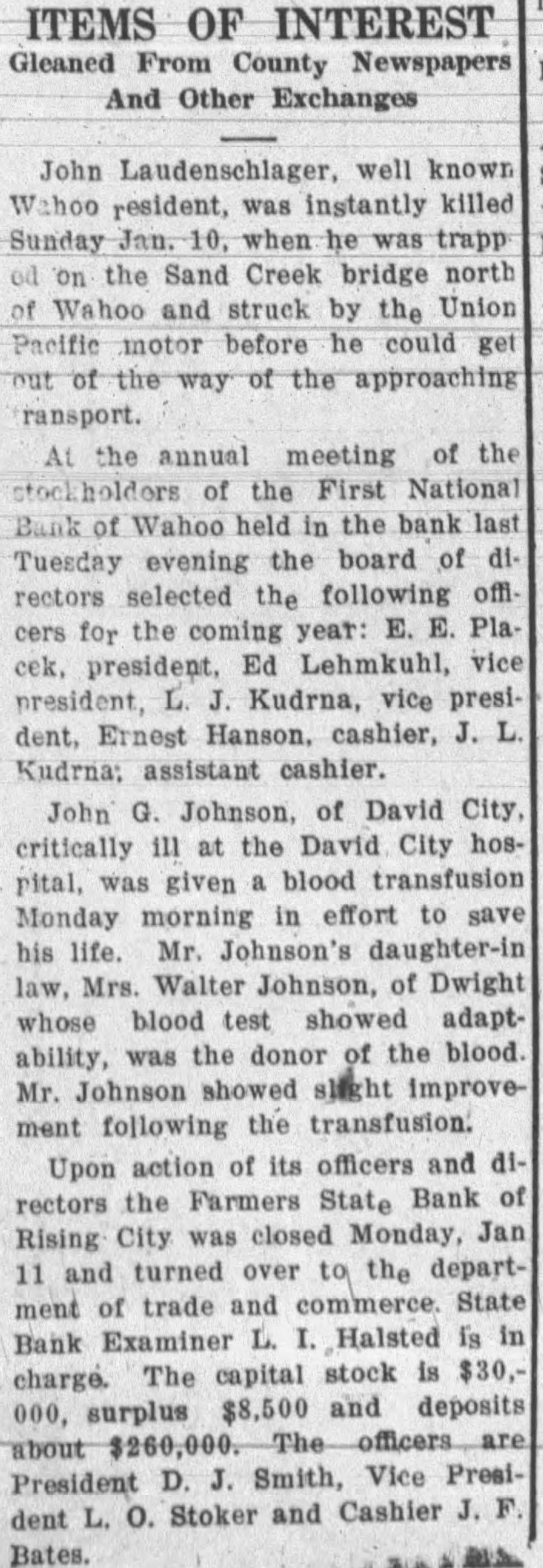 ITEMS OF INTEREST Gleaned From County Newspapers And Other Exchanges John Laudenschlager, well known Wahoo resident, was instantly killed Sunday Jan. 10, when he was trapp od on the Sand Creek bridge north of Wahoo and struck by the Union Pacific motor before he could get out of the way of the approaching ransport. At the annual meeting of the stockholders of the First National Bank of Wahoo held in the bank last Tuesday evening the board of directors selected the following officers for the coming year: E. E. Placek, president, Ed Lehmkuhl, vice president, L. J. Kudrna, vice president. Ernest Hanson. cashier, J. L. Kudrna: assistant cashier. John G. Johnson, of David City, critically ill at the David City hospital, was given a blood transfusion Monday morning in effort to save his life. Mr. Johnson's daughter-in law, Mrs. Walter Johnson, of Dwight whose blood test showed adaptability, was the donor of the blood Mr. Johnson showed slight improvement following the transfusion. Upon action of its officers and directors the Farmers State Bank of Rising City was closed Monday, Jan 11 and turned over to the department of trade and commerce. State Bank Examiner L. I. Halsted is in charge. The capital stock is $30,000, surplus $8,500 and deposits about $260,000. The officers are President D. J. Smith, Vice President L. O. Stoker and Cashier J. F. Bates.