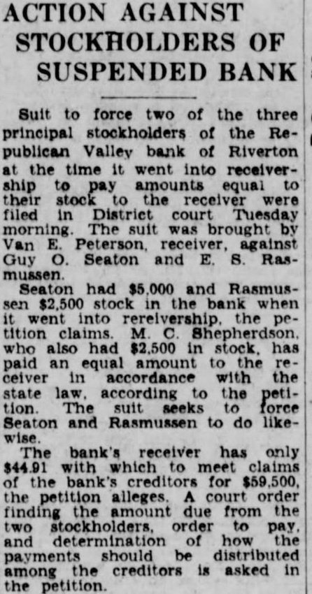 ACTION AGAINST STOCKHOLDERS OF SUSPENDED BANK Suit to force two of the three principal stockholders of the Republican Valley bank of Riverton at the time it went into receivership to pay amounts equal to their stock to the receiver were filed in District court Tuesday morning The suit was brought by Van E. Peterson. receiver. against Guy O. Seaton and E. S. Rasmussen. Seaton had $5,000 and Rasmussen $2,500 in the bank when went into rereivership. the petition claims. M C. Shepherdson. who also had $2,500 in stock, has paid an equal amount to the receiver in accordance with the state law. according to the petition. The suit seeks to force Seaton and Rasmussen to do likeThe bank's receiver has only $44.91 with which to meet claims of the bank's creditors for $59,500. the petition alleges. A court order finding the amount due from the two stockholders. order to pay. and determination of how the payments should be distributed among the creditors is asked in the petition.
