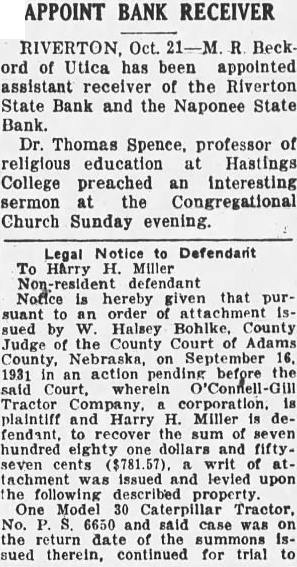 APPOINT BANK RECEIVER RIVERTON, Oct. R Beck ord of Utica has been appointed assistant of the Riverton State Bank and the Naponee State Bank. Dr. Thomas Spence, professor of religious education at Hastings College preached an interesting sermon at the Congregational Church Sunday evening. Legal Notice Defendant To Miller Non-resident defendant hereby that pursuant order sued Halsey Bohlke, County Judge the County Court County, Nebraska, September 1931 action Tractor Company, plaintiff and Harry Miller fendant, recover sum hundred writ tachment issued and levied upon following described property One Model Caterpillar Tractor, said case return sued therein, continued for trial