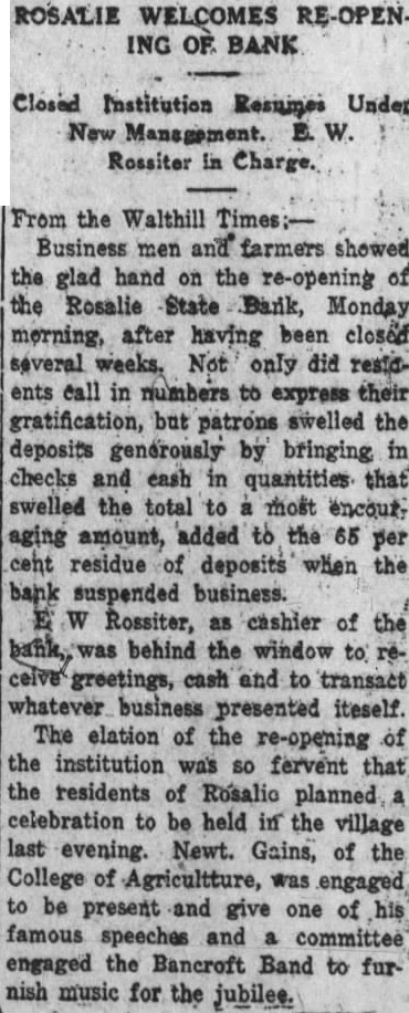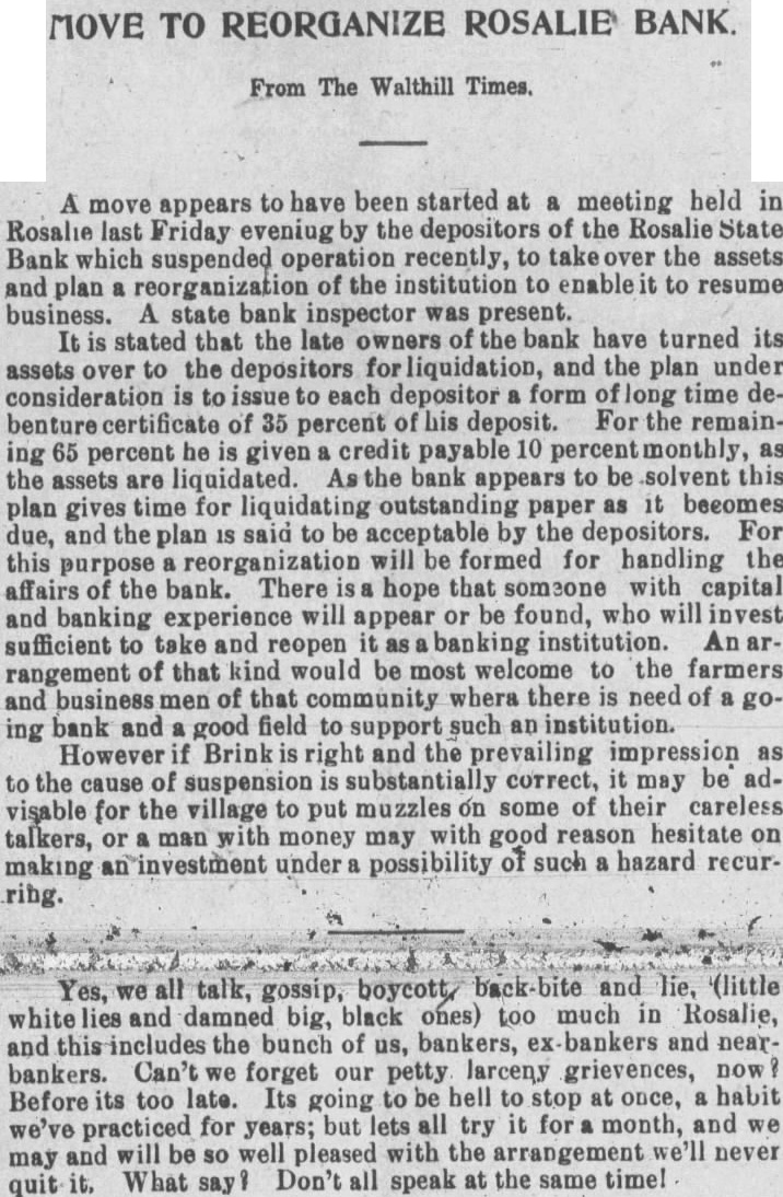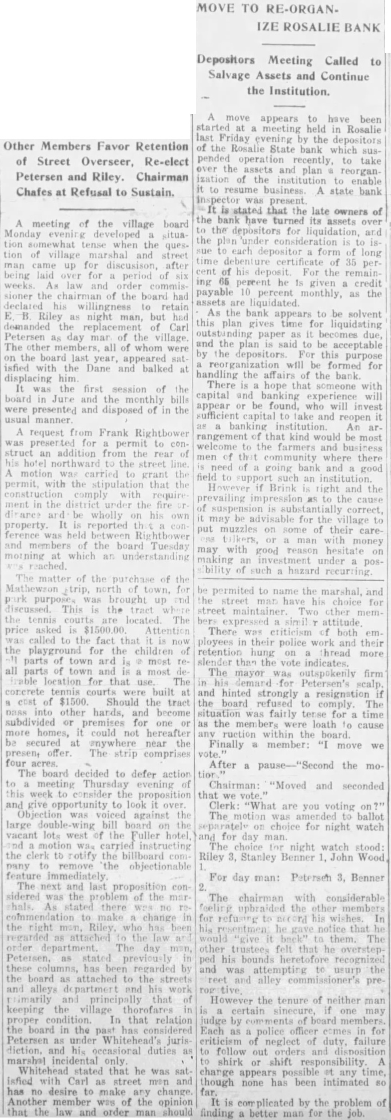 MOVE TO RE-ORGANIZE ROSALIE BANK Other Members Favor Retention of Street Overseer, Re-elect Petersen and Riley. Chairman Chafes at Refusal to Sustain. A meeting of the village board Monday evening developed situation somewhat tense when the question of village marshal and street man came up for discusison, after being laid over for period of SIX weeks. As law and sioner the of the board had declared his to retain B Riley as night man, but had demanded the of Carl Petersen as day mar of the village The other members, all of whom were on the board last year, appeared isfied with the Dane and balked displacing him. It was the first session of the board in June and the monthly bills were presented and disposed of in the usual manner A request from Frank Rightbower was presented for permit struct an addition from the rear his hotel northward the street A motion carried grant permit, with the that the construction comply with ment in the district the dirance be wholly on his property. It reported held and the board Tuesday morning at which understanding reached. The matter of the purchase of Mathewson strip, north of town, purposes was brought up discussed. This the the are located. The price asked $1500.00 Attention called to fact that now the playground for the children of parts of town and most all parts town most location for that use. The concrete tennis courts built at cost of $1500 Should the tract into other hands, and become subdivided or premises for one or more homes, could not hereafter be secured at anywhere near the present offer The strip comprises four The board decided to defer action meeting Thursday evening of this week to consider the proposition and give opportunity to look it over Objection was voiced against the large bill board the vacant lots west of the Fuller motion was carried instructing the clerk to rotify the billboard company remove the objectionable feature immediately The next and last proposition considered was the of the mar As stated there to make change the right man, Riley. has been regarded as attached to the law department. The day man, Petersen. as stated these columns, has been regarded by the board as attached to the streets and alleys partment and his work Timarily and principally that of keeping the village thorofares proper condition. In that relation the board in the past has Petersen under Whitehead's jurisdiction, and his duties marshal incidental only stated that he was satisfied with Carl as street man and has no desire to make any change. Another member was of the opinion that the law and order man should Depositors Meeting Called to Salvage Assets and Continue the Institution. move appears to have been started at meeting held in Rosalie last Friday evening by the depositors of the Rosalie State bank which suspended operation recently, to take over the assets and plan reorgan ization of the institution to enable to resume business A state bank Inspector was present. stated that the late owners of the bank have turned its assets over the depositors for liquidation, and the plan 'under consideration is to is sue to each depositor form of long time certificate of 35 per cent of his deposit. For the remaining 65 percent he Is given credit payable 10 percent monthly, as the assets are As the bank appears to be solvent this plan gives time for liquidating paper as it becomes due and the plan said to be acceptable by the depositors For this purpose will be formed for handling the affairs the bank There hope that with capital and banking will appear or be found, who will invest sufficient capital take and reopen banking An ar rangement that kind would be most the farmers and business men of community where there need of going bank and good field to support such an institution Brink right and the prevailing impression as to the cause of substantially correct may be advisable for the village to put muzzles on some of their careman with money may with good reason hesitate on making under posbility such a hazard be permited to name the marshal, and street man have his choice for street maintainer Two other mem expressed a attitude There was etiticism of both em ployees in their police work and their retention hung on thread more slender than the vote indicates. The mayor was outspokenly firm his demard for Petersen's scalp and hinted strongly resignation if the board refused to comply. The situation was fairly tense for time as the members were loath cause ruction within the board. Finally member: move we vote. After a the mo- Chairman: "Moved and seconded that we Clerk: "What are you voting The motion was amended to ballot separately on choice for night watch and for day man The choice night watch stood Riley 3. Stanley Benner John Wood For day man: Petersch 3, Benner The chairman with considerable feeling upbraided the other members for refusing to his wishes. In his resentment he notice that would back" them. The other trustees felt that he overstepped his bounds heretofore recognized and was attempting to usurp the and alley preHowever the tenure of neither man certain sinecure, one may judge by board Each as police officer comes in for criticism of neglect of duty, failure follow out orders and disposition shirk or shift responsibility A change appears possible at any time, though none has been intimated SO far. It is complicated by the problem of finding a better man for the job.