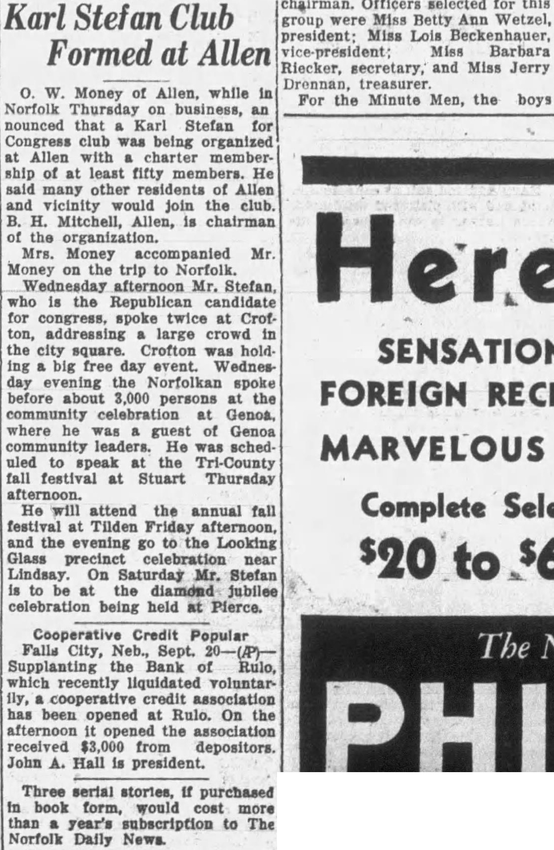 Club Formed at Allen Money of Allen, while For the Minute Men, the boys Norfolk Thursday on business, an nounced that Karl Stefan for Congress club was being organized at Allen with charter membership of at least fifty He said many other of Allen and vicinity would join club. B. H. Mitchell, Allen, is chairman of the organization. Mrs. Money accompanied Mr. Here's Money on the trip to Norfolk. Wednesday afternoon Mr. Stefan, who the Republican candidate for congress, spoke twice at Crof. ton, addressing large crowd the city square. Crofton was hold. SENSATIONAL ing big free day event. Wednesday evening the Norfolkan spoke before about 3,000 persons at the celebration at Genoa, where he guest of Genoa leaders. He scheduled to speak at the Tri-County fall festival at Stuart Thursday afternoon. Complete Selection He will attend the annual fall festival at Tilden Friday afternoon, and the evening go to the Looking Glass precinct celebration near Lindsay. On Saturday Mr. Stefan to be at the diamond jubilee celebration being held at Pierce. Cooperative Credit Popular Falls City, Neb., Sept. Supplanting the Bank of Rulo, which recently liquidated voluntarily, cooperative credit association has been opened at Rulo. On the afternoon opened the association received $3,000 from depositors. John Hall is president. Three serial stories, if purchased book form, would cost more than year's subscription to The Norfolk Daily News.