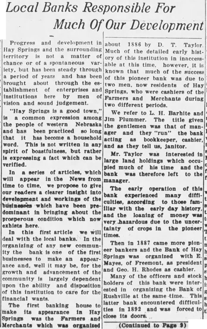 dominant in bringing about the prosperous condition which now exhists here. In this first article we will deal with the local banks. In the organizing of any new community the bank is one of the first businesses to make an appearance and. well may be, for the growth and advancement of the community is largely dependent upon the ability and disposition this institution to care for the financial wants. The first banking house to make its appearance in Hay Springs was the Farmers and Merchants which was organized Local Banks Responsible For Development about 1886 by D. Taylor Much of the detailed early history of this institution in inaccessable at this time. however, it known that much of the success of this pioneer bank was due two men. now residents of Hay Springs, who were cashiers of the Farmers and Merchants during two different periods. We refer to L. H. Barhite and Jim Plummer. The title given the gentlemen was that of manager and they "run" the bank acting bookkeeper, cashier, and as they tell us, janitor. Mr. Taylor was interested large land holdings which occupied much of his time and the bank was therefore left to the manager. The early operation of this bank experienced many difficulties, according to those illar with the early day history, and the loaning of money was very hazardous due to the uncertainty of crops in the pioneer times. Then in 1887 came more pioneer bankers and the Bank of Hay Springs organized with Mayes, of Freemont, as president and Geo. H. Rhodes as cashier. Many of the officers and stock holders of this bank were interested in organizing the Bank of Rushville at the same time. This latter bank encountered difficulties in 1892 and was forced close its doors. (Continued to Page