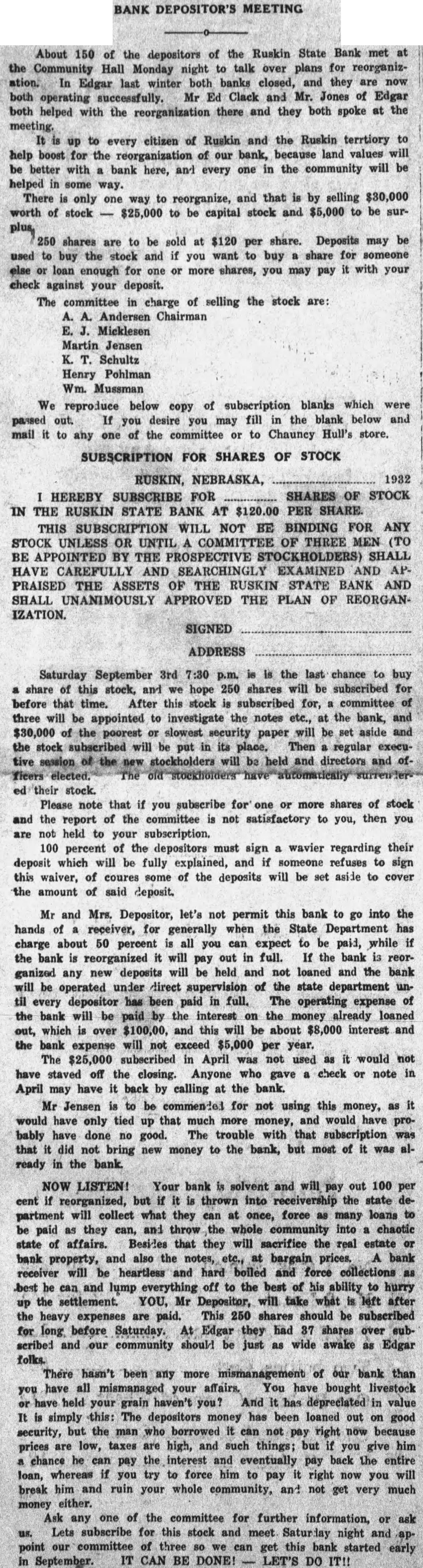 About 150 of the depositors of the Ruskin State Bank met at the Community Hall Monday night to talk over plans for reorganization. In Edgar last winter both banks closed, and they are now both operating successfully. Mr Ed Clack and Mr. Jones of Edgar both helped with the reorganization there and they both spoke at the meeting. It is up to every citizen of Ruskin and the Ruskin terrtiory to help boost for the reorganization of our bank, because land values will be better with a bank here, and every one in the community will be helped in some way. There is only one way to reorganize, and that is by selling $30,000 worth of stock - $25,000 to be capital stock and $5,000 to be surplus,