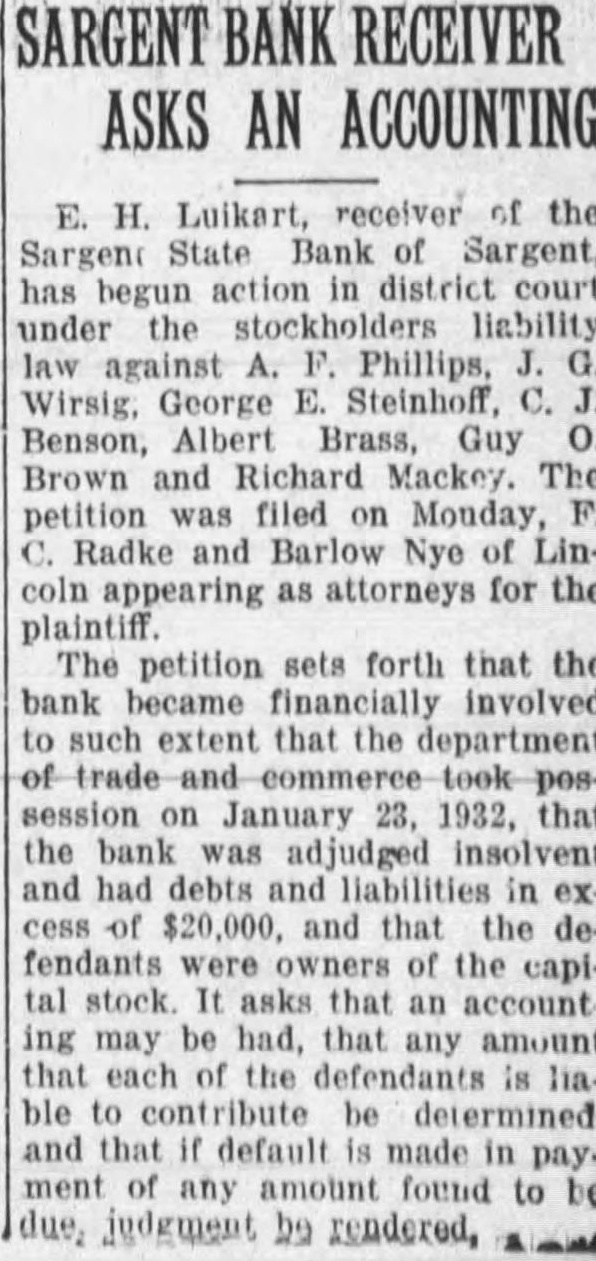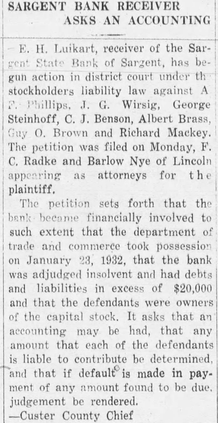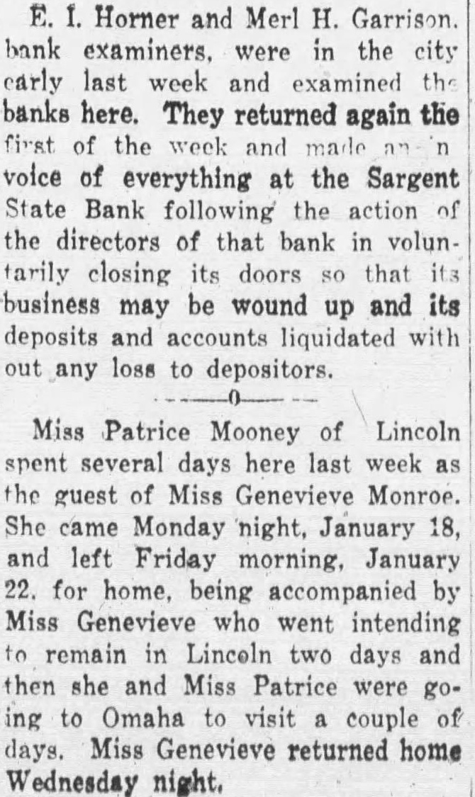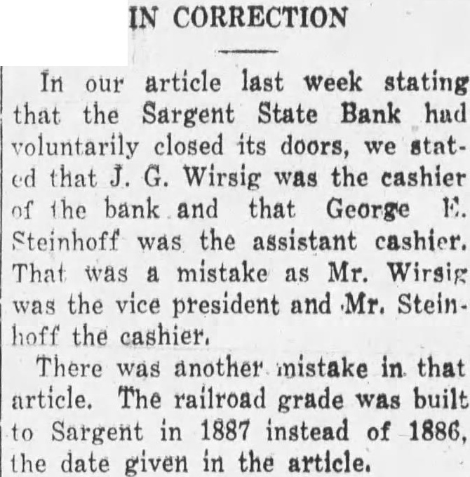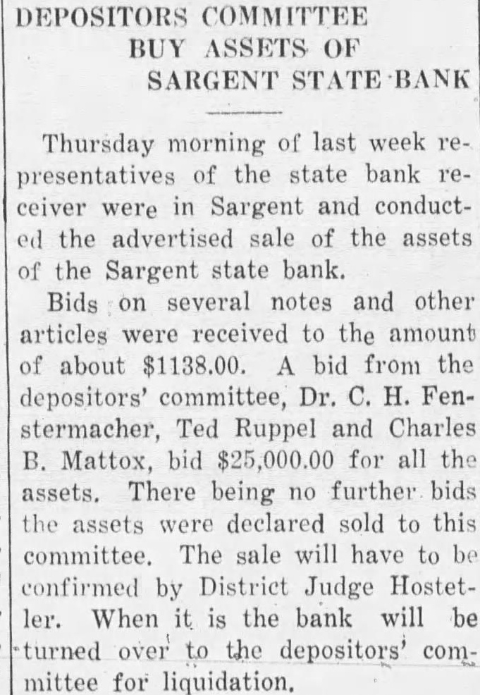 (This article was written for the An index of the public confidence Leader James Murray who manifest be noted from the may kindly voluntarily offered to furnish fact that in the first two hours of this he its re-opening, deposits to the was writing the celebration for other papers. $4,200. were placed in the bank which Mr. Murray, by the the days were raised by willing way, nominee for state depositors nearly tor from the twenty third senatorial evening district which the counties week one of the directors comprises of Blaine, Custer, Gafield, and told the Leader editor that at that Loup Valley. Now, that time the deposits since the reopening Maine has spoken loudly for the Democratic Nomi- exceeded the by nearly nees in that state, looks if the as only thing that remains to be done And where there more in the matter of his election to mising field bank to tabulate his than right with Sargent majority.) Of historic moment the event keting center for territory Thursday, here in reaches eighty miles north September the date miles up the Middle Loup chosen for celebrating sett, the re-opening of the Farmers State west to another railroad point, Bank which fifty to miles suspended on Monday Dunning, morning, and northwest and even beyond to reach February re-opened about three o'clock, after- the extent of Sargent's trade Saturday noon, September in that direction and bringing tory seven months revival south, twenty six miles to stagnation, of business morale, and injection the nearest railroad point to an hope and We believe and the intervening domain courage. south, was Aristotle who said that between Sargent and Ansley, lating monetary medium the life- with soil of the Loess soil blood of civilization. degree agriculturally with any compare witnessed the of the ancient earth. Some the other saying spot on philosopher exemplified in the seven reaches mentioned above are largely months the but the world's following the grazing lands, are banks here; the circulating finest adjunct farming region dium ceased to flow and though stocked with herds of livestock, ilization did not disappear here usually and fattened in the Sargent, business morale drug- fall and winter with the corn and dormant life succeeded buoyant produced on the fertile farms life in commercial circles, and doubt the town. It augurs favorably and uncertainty prevailed. On the continuance of strong bank announcement on September that such region, center of the Farmers State Bank had met all orable combination. the rigid requirements of the State arrived which was September banking board who assumed on for the celebracharge the day planned the suspended bank, and tion and kind Providence provided open for business and announcing wil- finest early autumn days one the lingness to thirty five percent that dawned. Great crowds from pay ever all deposits not in the depositors all the country side and from other pool, acted as an hypodermic towns began to into the city on pour public morale and instant upturn The portable band stand had business could be noted. moved position in front the marketing center such this bank building. Seated therein and band, which has made such inroads begin day of furnishing late into the business of almost continuous band music to be shown that the occasion few selec. tock and other products of the farm tions were played and to the band and ranch were shipped from this stand platform ascended Roy Sweet, tation the value of two million the and Edward new president, year, can be the cashier. Both men the inconvenience of handling this scheduled for an address. Some wonstupendous volume of business with- dered how Sweet, successful farmer bank. rancher, had not given especial Just week apart the two banks effort toward acquiring proficiency closed and we wish were writing public would acquit speaking the re-opening of the Sargent State The writer had no such doubts. Bank well as the Farmers State. former when Sweet and the years, Both institutions were revered old writer both lived in the hill country landmarks here, and, closely identi- north east of Sargent several miles, fied with the growth and advance- of the socisome country literary ment of the town and surrounding debates held out there for ety, country, had weathered all kinds in the winter season, noted we adverse conditions and stood like two that he formidable antagonist sentinel rocks, and would have, in in joint debate, and gained experiprobability, withstood the thereby that would stand him present depression, appalling as good stead, and such was the they not been called upon to stand When Mayor Cosner called him the drain of their finances it took he responded, and began by relating buy abroad endless thousands of bush humorous story, serviceable for the of corn to supply the large feed- occasion, which furnished good. operations carried here last overture, and then proceeded in about the normal volume in how the orders of the state bankyear the face of corn ing board met, and the long very poor crop, the fattened stock when arduous and almost vexatious tasks failing in some instances to that were surmounted. Ed pay feed the straw, called responded and announced mound straw that could speach the camel's back and both banks wanted to do but was prepared written The fell pall the town the occasion, had been news as on paper and the two institu- carefully prepared and community tions were lineal descendants of two ment of the policies and practices tiny banks that were set up here the new bank, and are differ the of of the hamlet from the old practices. early years ed Sargent that existed way the Next, Mayor Cosner introduced Middle Loup valley above Clarence Miller of Ansley who road and surrounded by an untamed candidate on the nonpolitical ticket and rating but little for the office of county judge of Cus more than an of civilization. ter county. Mr. Miller interoutpost gave State Bank justly laid esting talk on the advantage of Sargent c