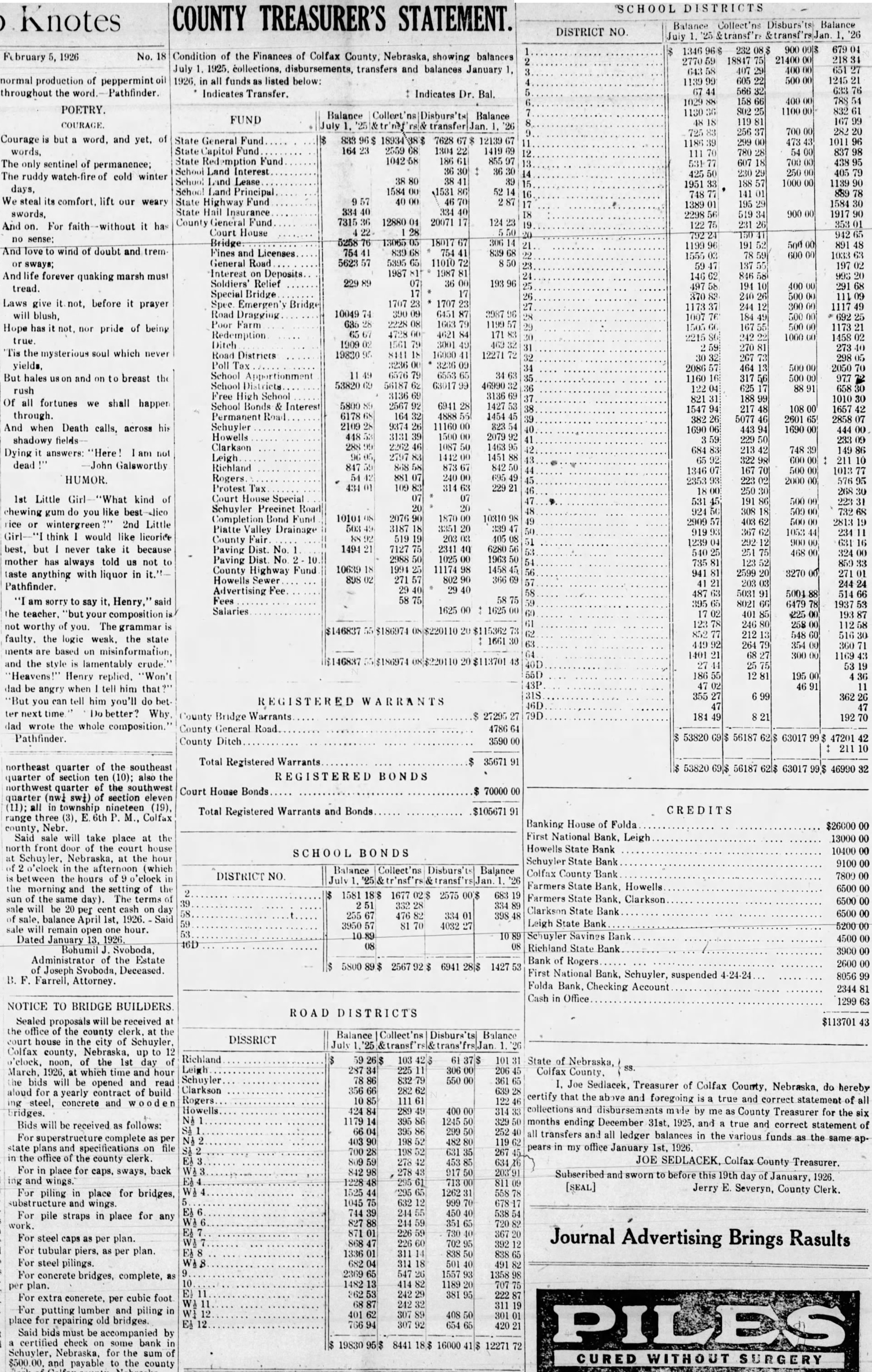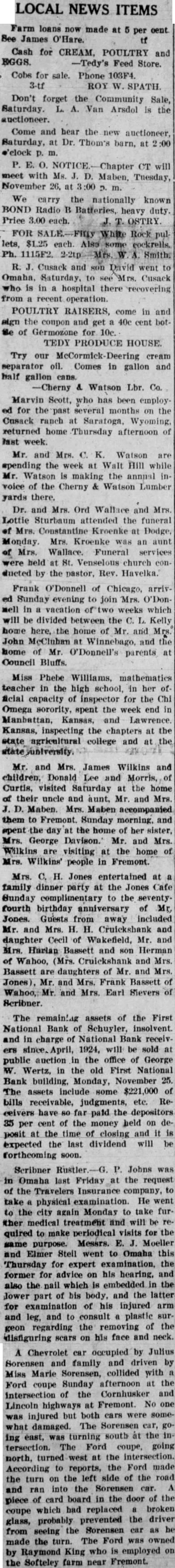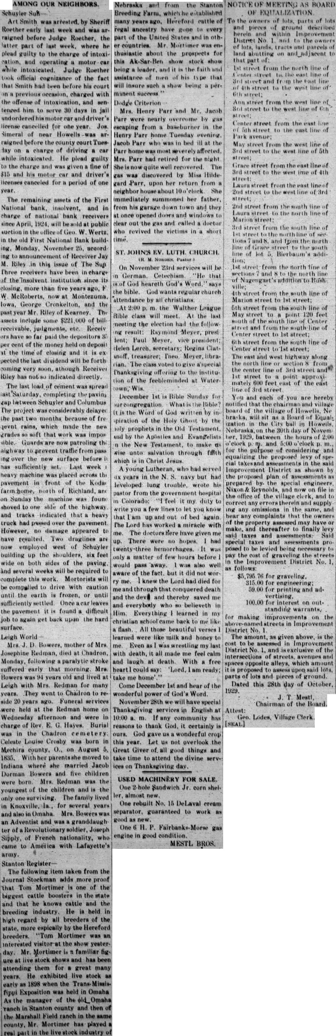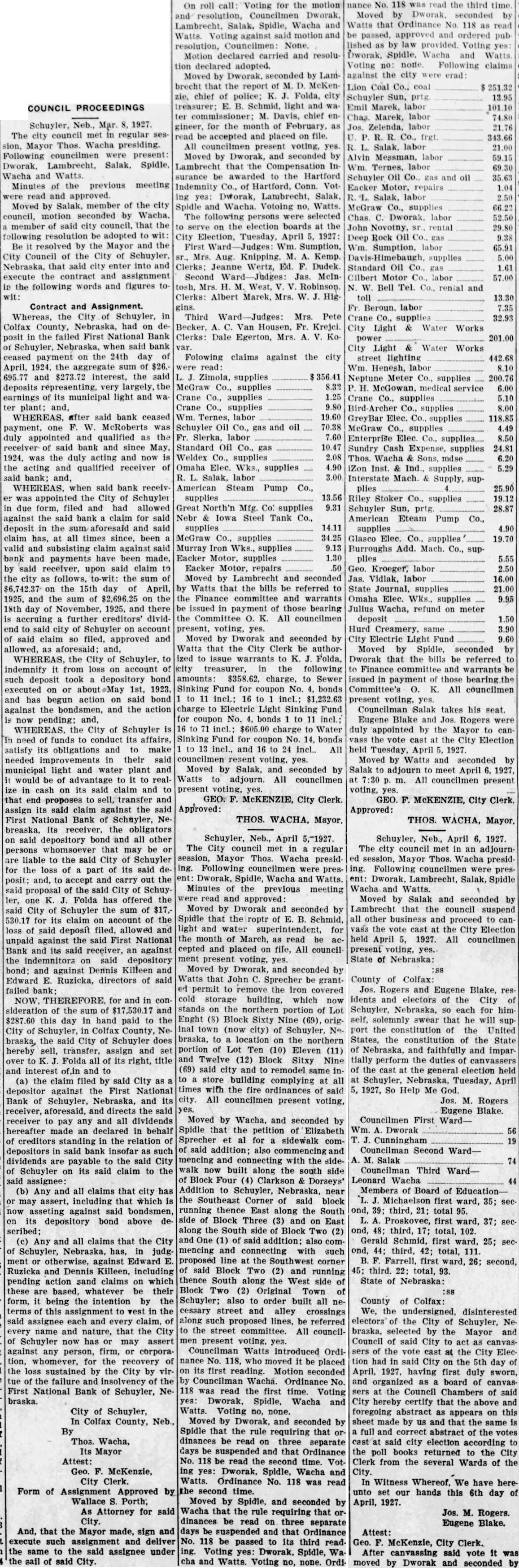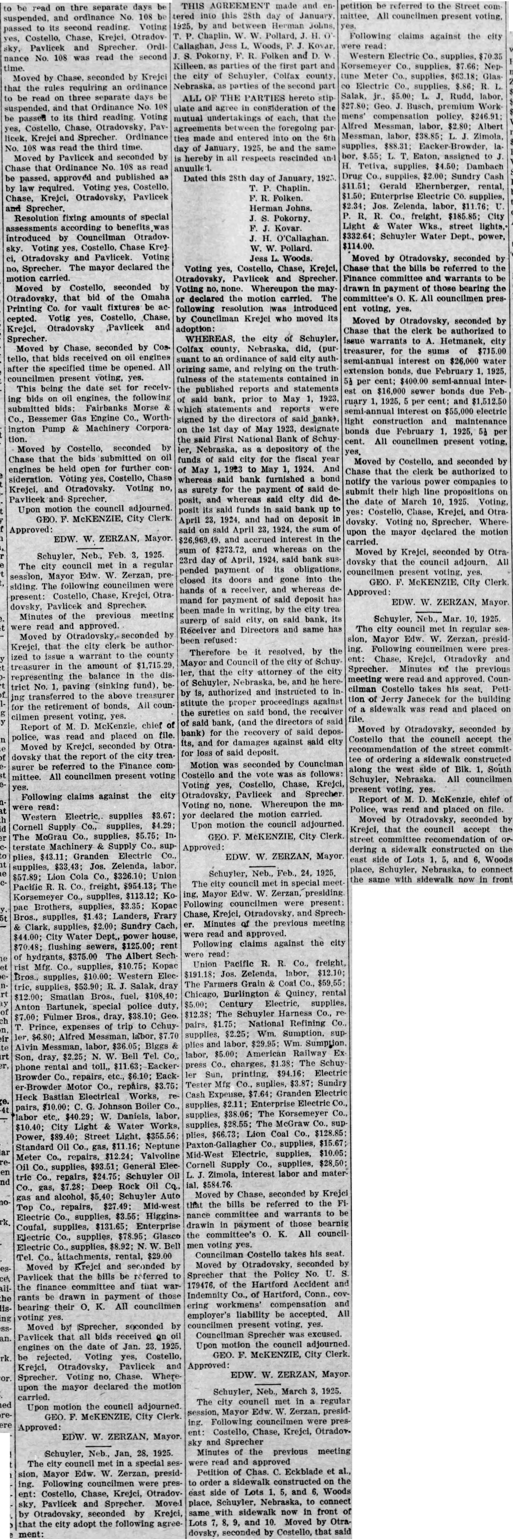 to be read on thre separate days be suspended, and ordinance No 108 be to its second reading. Voting passed yes, Costello, Chase, Krejci, Otradovsky, Pavlicek and Sprecher. Ordinance No. 108 was read the second time. Moved by Chase, seconded by Krejci that the rules requiring an ordinance to be read on three separate days be suspended, and that Ordinance No. 108 be passed to its third reading Voting Costello, Chase, Otradovsky, Pavlicek, Krejci and Sprecher. Ordinance No. 108 was read the third time. Moved by Pavlicek and seconded by Chase that Ordinance No. 108 as read be passed, approved and published as by law required. Voting yes, Costello, Chase, Krejci, Otradovsky, Pavlicek and Resolution fixing amounts of special assessments according to benefits introduced by Councilman Otradovsky. Voting yes, Costello, Chase Krejci, Otradovsky and Pavlicek. Voting no, Sprecher. The mayor declared the motion carried. by Costello, seconded by Moved that bid of the Omaha Otradovsky, Printing Co. for vault fixtures be accepted. Votig yes, Costello, Chase, Otradovsky ,Pavlicek and Krejci, Sprecher. Moved by Chase, seconded by Cos. tello, that bids received on oil engines after the specified time be opened. All councilmen present voting, yes. This being the date set for receiving bids on oil engines, the following submitted bids: Fairbanks Morse Co., Bessemer Gas Engine Co., Worthington Pump & Machinery Corporation. Moved by Costello, seconded by Chase that the bids submitted on oil engines be held open for further consideration. Voting yes, Costello, Chase and Otradovsky. Voting no, Krejci, and Sprecher. Upon motion the council adjourned. GEO. McKENZIE, City Clerk. Approved: EDW. W. ZERZAN, Mayor. Neb., Feb. 3, 1925. Schuyler, The city council met in regular session, Mayor Edw. W. Zerzan, presiding. The following councilmen were present: Costello, Chase, Krejci, Otradovsky, Pavlicek and Sprecher. Minutes of the previous meeting were read and approved. Moved by by Krejci, that the city clerk be authorized to issue warrant to the county in the amount of treasurer the balance in the disrepresenting trict No. paving (sinking fund), betransferred to the above treasurer retirement of bonds. All counfor the cilmen present voting, yes. Report of McKenzie, chief of read and placed on file. police, was Moved by Krejci, seconded by Otradovsky that the report of the city treasurer be referred to the Finance committee. All councilmen present voting yes. Following claims against the city were read: Western Electric,. supplies Cornell Supply Co., supplies, $4.29; The McGrau Co., supplies, $5.75; In. terstate Machinery & Supply Co., supplies, Granden Electric Co., supplies, Jos. Zelenda, labor, $57.89; Lion Cola Co., $326.10; Union Pacific R. R. Co., freight, The Korsemeyer Co., supplies, $113.12; Kopac Brothers, supplies, $3.35; Kopac Bros., supplies, Landers, Frary Clark, supplies, $2.00; Sundry Cach, City Water Dept., power house, flushing sewers, $125.00; rent of hydrants, $375.00 The Albert Sech rist Mfg. Co., supplies, $10.75; Kopac Bros., supplies, $10.00; Western Electric, supplies, Salak, dray $12.00; Smatlan Bros, fuel, Anton Bartunek, special police duty, $7.00; Fulmer Bros., dray, $38.10; Geo. Prince, expenses of trip to CchuyAlfred Messman, labor, Alvin Messman, labor, Biggs & Son, $2.25; Bell Tel. Co., dray, phone rental and toll,, Browder Co., repairs, etc., $6.10; Eack Motor Co., repairs, $3.75; Heck Bastian Electrical Works, pairs, $10.00; Johnson Boiler Co., labor etc., $40.29; W. Daniels, labor, City Light Water Works, Power, Street Light, $355.56; Standard Oil Co., gas, Neptune Meter repairs, $12.24; Valvoline Oil Co., supplies, General Electric Co., repairs, $24.75; Schuyler Oil Co., gas, $7.28; Deep Rock Oil Cq., gas and alcohol, Schuyler Auto Co., repairs, Mid-west Top Electric Co., supplies, $3.55; HigginsCoufal, supplies, $131.65; Enterprise Electric Co., supplies, $78.95; Glasco Electric supplies, $8.92; W. Bell Tel. Co., attachments, rental, Moved by Krejci and seconded by Pavlicek that the bills be referred to the finance committee and that warrants be drawn in payment those bearing their K. All councilmen voting yes. Moved by Sprecher, seconded by Pavlicek that all bids received on oil engines on the date of Jan. 23, 1925, be rejected. Voting yes, Costello, Krejci, Otradovsky, Pavlicek and Sprecher. Voting no, Chase. Whereupon the mayor declared the motion carried. Upon motion the council adjourned. GEO. F. McKENZIE, City Clerk. Approved: EDW. W. ZERZAN, Mayor. Schuyler, Neb., Jan. 28, 1925. The city council met in special sion, Mayor Edw. W. Zerzan, presiding. Following councilmen were present: Costello, Chase, Krejci, Otradovsky, Pavlicek and Sprecher. Moved by Otradovsky, seconded by Krejci, that the city adopt the following agree- THIS AGREEMENT made and tered into this 28th day of January, 1925, by and between Herman Johns, Chaplin, W. W. Pollard, H. Callaghan, Jess L. Woods, Kovar, Pokorny, R. Folken and Killeen, parties of the first and the city of Schuyler, Colfax county, Nebraska, as parties of the second part ALL OF THE PARTIES hereto ulate and agree in consideration of the mutual undertakings of each, that the agreements between the foregoing parties made and entered into on the 6th day of January, 1925, be and the same hereby in all respects rescinded and Dated this 28th day of January, 1923. Chaplin. Folken. Herman Johns. S. Pokorny. Kovar H. O'Callaghan. W. W. Pollard. Jess L. Woods. Voting yes, Costello, Chase, Krejci, Otradovsky, Pavlicek and Sprecher. Voting no, none. Whereupon the mayor declared the motion carried. The following resolution was introduced Councilman Krejci who moved its adoption: WHEREAS, the city of Schuyler, Colfax county, Nebraska, did, (pursuant to an ordinance of said city authorizing same, and relying on the truthfulness of the statements contained in the published reports and statements said bank, prior to May 1, 1923, which statements and reports
