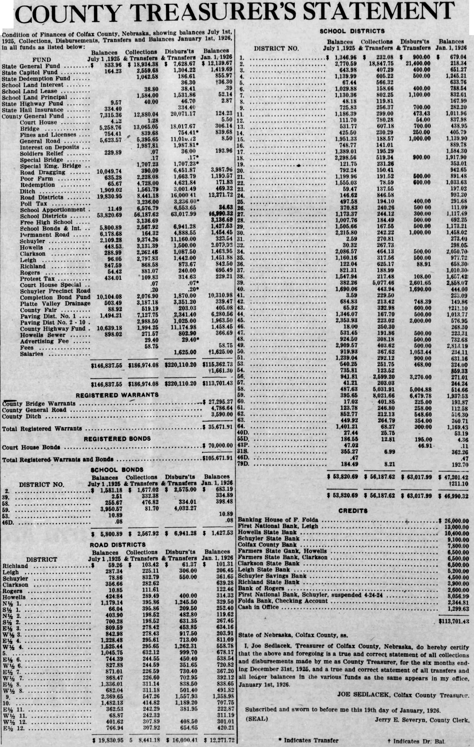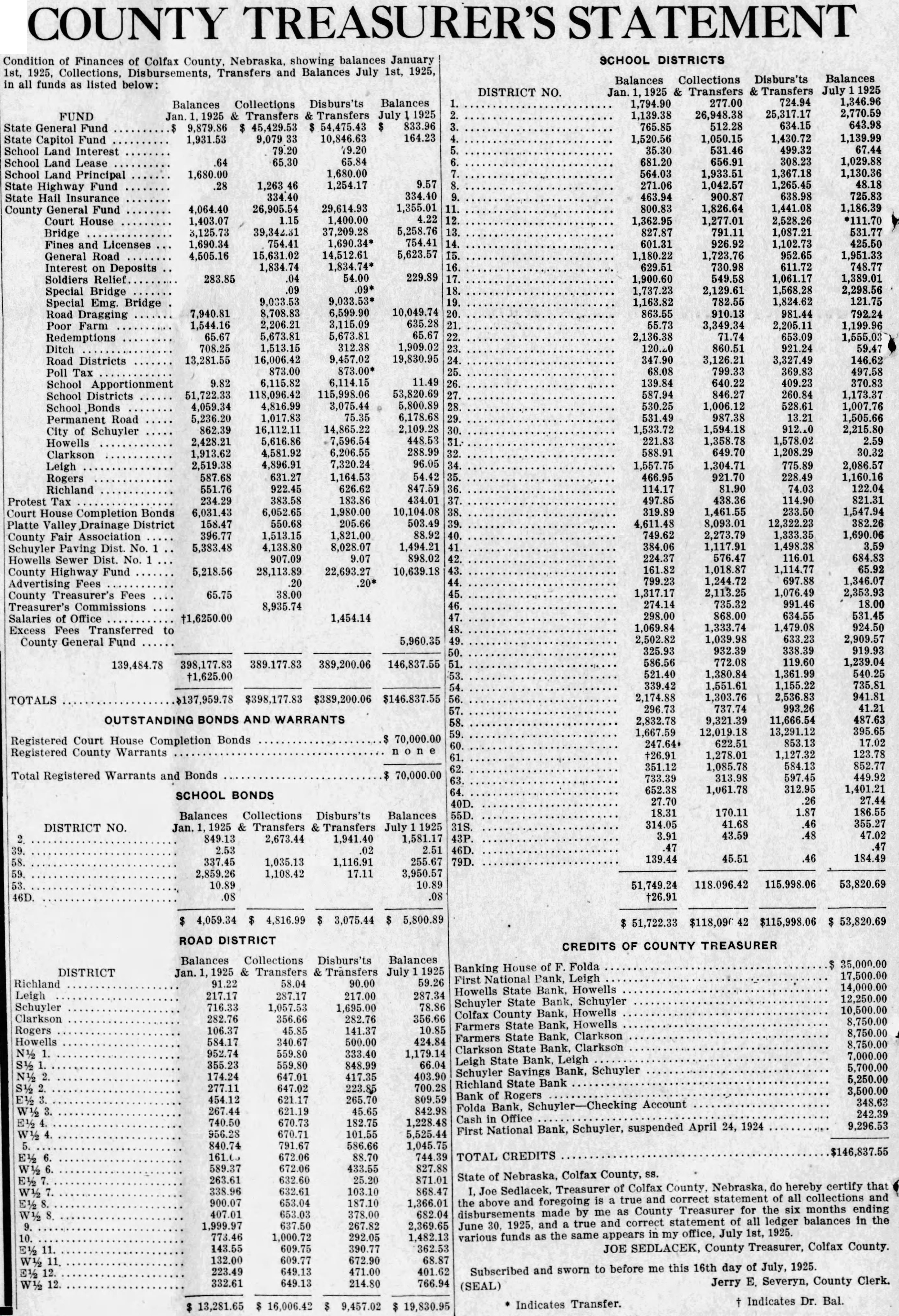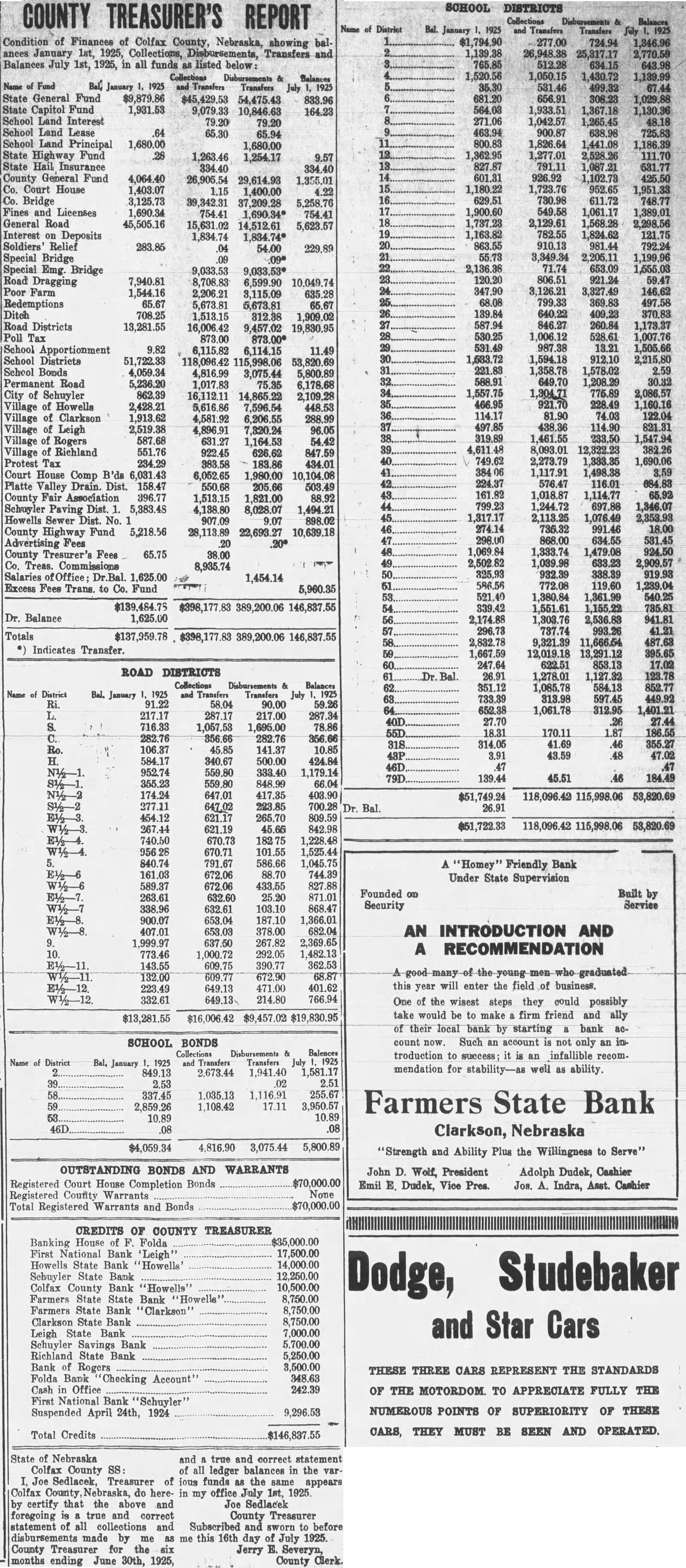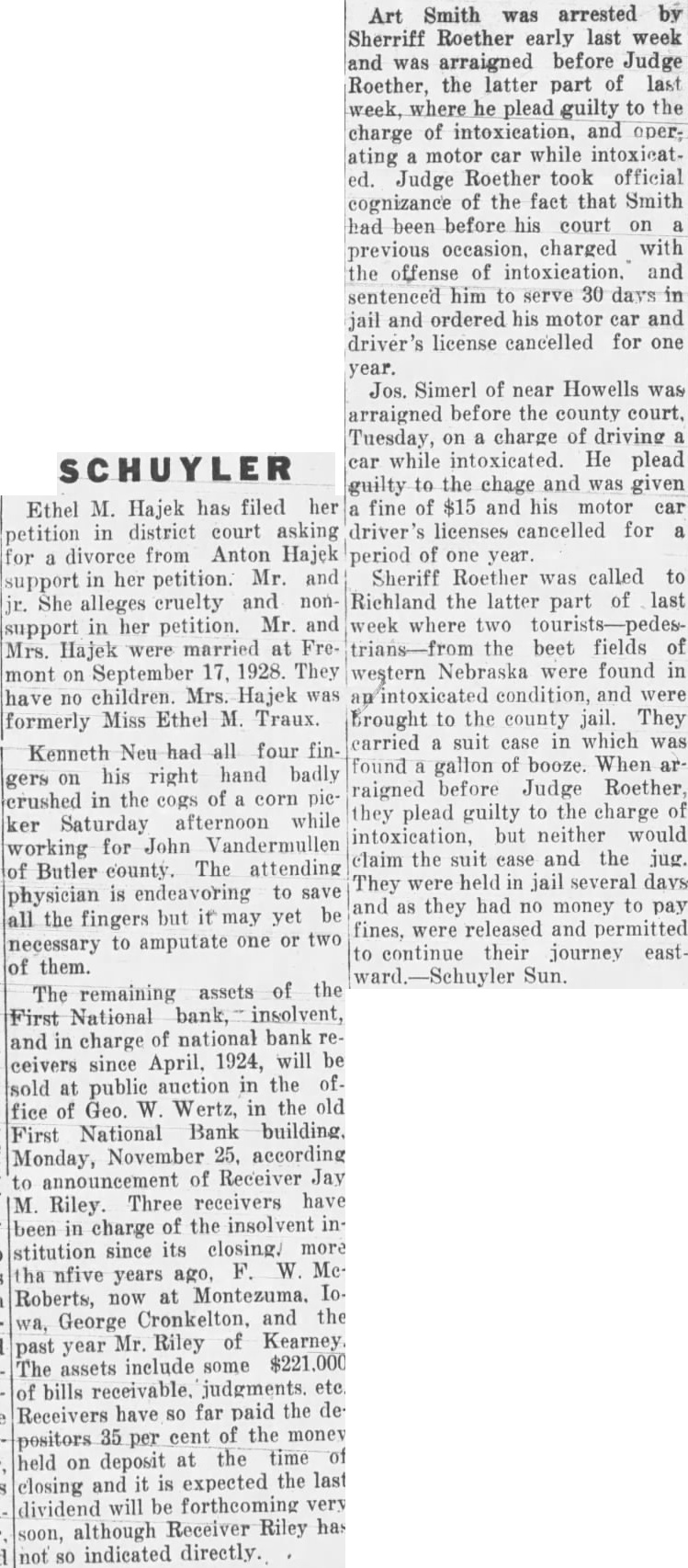 to be read on thre separate days be suspended, and ordinance No 108 be to its second reading. Voting passed yes, Costello, Chase, Krejci, Otradovsky, Pavlicek and Sprecher. Ordinance No. 108 was read the second time. Moved by Chase, seconded by Krejci that the rules requiring an ordinance to be read on three separate days be suspended, and that Ordinance No. 108 be passed to its third reading Voting Costello, Chase, Otradovsky, Pavlicek, Krejci and Sprecher. Ordinance No. 108 was read the third time. Moved by Pavlicek and seconded by Chase that Ordinance No. 108 as read be passed, approved and published as by law required. Voting yes, Costello, Chase, Krejci, Otradovsky, Pavlicek and Resolution fixing amounts of special assessments according to benefits introduced by Councilman Otradovsky. Voting yes, Costello, Chase Krejci, Otradovsky and Pavlicek. Voting no, Sprecher. The mayor declared the motion carried. by Costello, seconded by Moved that bid of the Omaha Otradovsky, Printing Co. for vault fixtures be accepted. Votig yes, Costello, Chase, Otradovsky ,Pavlicek and Krejci, Sprecher. Moved by Chase, seconded by Cos. tello, that bids received on oil engines after the specified time be opened. All councilmen present voting, yes. This being the date set for receiving bids on oil engines, the following submitted bids: Fairbanks Morse Co., Bessemer Gas Engine Co., Worthington Pump & Machinery Corporation. Moved by Costello, seconded by Chase that the bids submitted on oil engines be held open for further consideration. Voting yes, Costello, Chase and Otradovsky. Voting no, Krejci, and Sprecher. Upon motion the council adjourned. GEO. McKENZIE, City Clerk. Approved: EDW. W. ZERZAN, Mayor. Neb., Feb. 3, 1925. Schuyler, The city council met in regular session, Mayor Edw. W. Zerzan, presiding. The following councilmen were present: Costello, Chase, Krejci, Otradovsky, Pavlicek and Sprecher. Minutes of the previous meeting were read and approved. Moved by by Krejci, that the city clerk be authorized to issue warrant to the county in the amount of treasurer the balance in the disrepresenting trict No. paving (sinking fund), betransferred to the above treasurer retirement of bonds. All counfor the cilmen present voting, yes. Report of McKenzie, chief of read and placed on file. police, was Moved by Krejci, seconded by Otradovsky that the report of the city treasurer be referred to the Finance committee. All councilmen present voting yes. Following claims against the city were read: Western Electric,. supplies Cornell Supply Co., supplies, $4.29; The McGrau Co., supplies, $5.75; In. terstate Machinery & Supply Co., supplies, Granden Electric Co., supplies, Jos. Zelenda, labor, $57.89; Lion Cola Co., $326.10; Union Pacific R. R. Co., freight, The Korsemeyer Co., supplies, $113.12; Kopac Brothers, supplies, $3.35; Kopac Bros., supplies, Landers, Frary Clark, supplies, $2.00; Sundry Cach, City Water Dept., power house, flushing sewers, $125.00; rent of hydrants, $375.00 The Albert Sech rist Mfg. Co., supplies, $10.75; Kopac Bros., supplies, $10.00; Western Electric, supplies, Salak, dray $12.00; Smatlan Bros, fuel, Anton Bartunek, special police duty, $7.00; Fulmer Bros., dray, $38.10; Geo. Prince, expenses of trip to CchuyAlfred Messman, labor, Alvin Messman, labor, Biggs & Son, $2.25; Bell Tel. Co., dray, phone rental and toll,, Browder Co., repairs, etc., $6.10; Eack Motor Co., repairs, $3.75; Heck Bastian Electrical Works, pairs, $10.00; Johnson Boiler Co., labor etc., $40.29; W. Daniels, labor, City Light Water Works, Power, Street Light, $355.56; Standard Oil Co., gas, Neptune Meter repairs, $12.24; Valvoline Oil Co., supplies, General Electric Co., repairs, $24.75; Schuyler Oil Co., gas, $7.28; Deep Rock Oil Cq., gas and alcohol, Schuyler Auto Co., repairs, Mid-west Top Electric Co., supplies, $3.55; HigginsCoufal, supplies, $131.65; Enterprise Electric Co., supplies, $78.95; Glasco Electric supplies, $8.92; W. Bell Tel. Co., attachments, rental, Moved by Krejci and seconded by Pavlicek that the bills be referred to the finance committee and that warrants be drawn in payment those bearing their K. All councilmen voting yes. Moved by Sprecher, seconded by Pavlicek that all bids received on oil engines on the date of Jan. 23, 1925, be rejected. Voting yes, Costello, Krejci, Otradovsky, Pavlicek and Sprecher. Voting no, Chase. Whereupon the mayor declared the motion carried. Upon motion the council adjourned. GEO. F. McKENZIE, City Clerk. Approved: EDW. W. ZERZAN, Mayor. Schuyler, Neb., Jan. 28, 1925. The city council met in special sion, Mayor Edw. W. Zerzan, presiding. Following councilmen were present: Costello, Chase, Krejci, Otradovsky, Pavlicek and Sprecher. Moved by Otradovsky, seconded by Krejci, that the city adopt the following agree- THIS AGREEMENT made and tered into this 28th day of January, 1925, by and between Herman Johns, Chaplin, W. W. Pollard, H. Callaghan, Jess L. Woods, Kovar, Pokorny, R. Folken and Killeen, parties of the first and the city of Schuyler, Colfax county, Nebraska, as parties of the second part ALL OF THE PARTIES hereto ulate and agree in consideration of the mutual undertakings of each, that the agreements between the foregoing parties made and entered into on the 6th day of January, 1925, be and the same hereby in all respects rescinded and Dated this 28th day of January, 1923. Chaplin. Folken. Herman Johns. S. Pokorny. Kovar H. O'Callaghan. W. W. Pollard. Jess L. Woods. Voting yes, Costello, Chase, Krejci, Otradovsky, Pavlicek and Sprecher. Voting no, none. Whereupon the mayor declared the motion carried. The following resolution was introduced Councilman Krejci who moved its adoption: WHEREAS, the city of Schuyler, Colfax county, Nebraska, did, (pursuant to an ordinance of said city authorizing same, and relying on the truthfulness of the statements contained in the published reports and statements said bank, prior to May 1, 1923, which statements and reports
