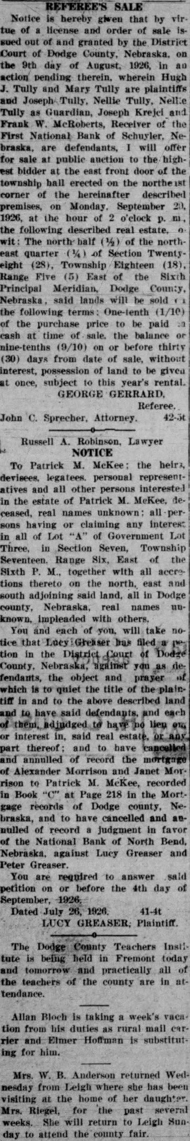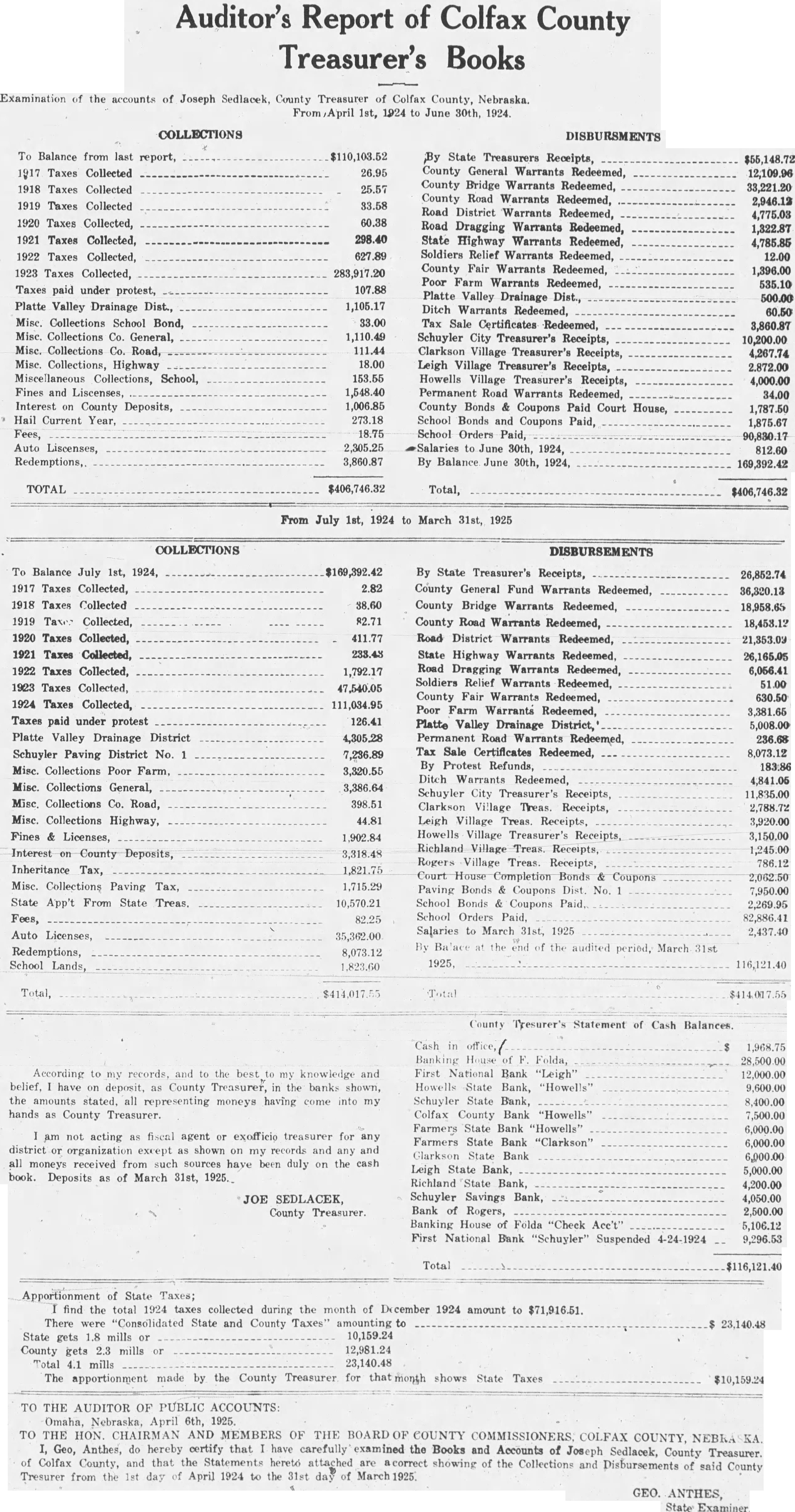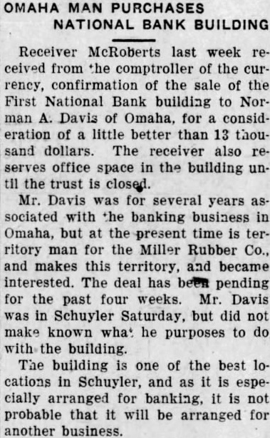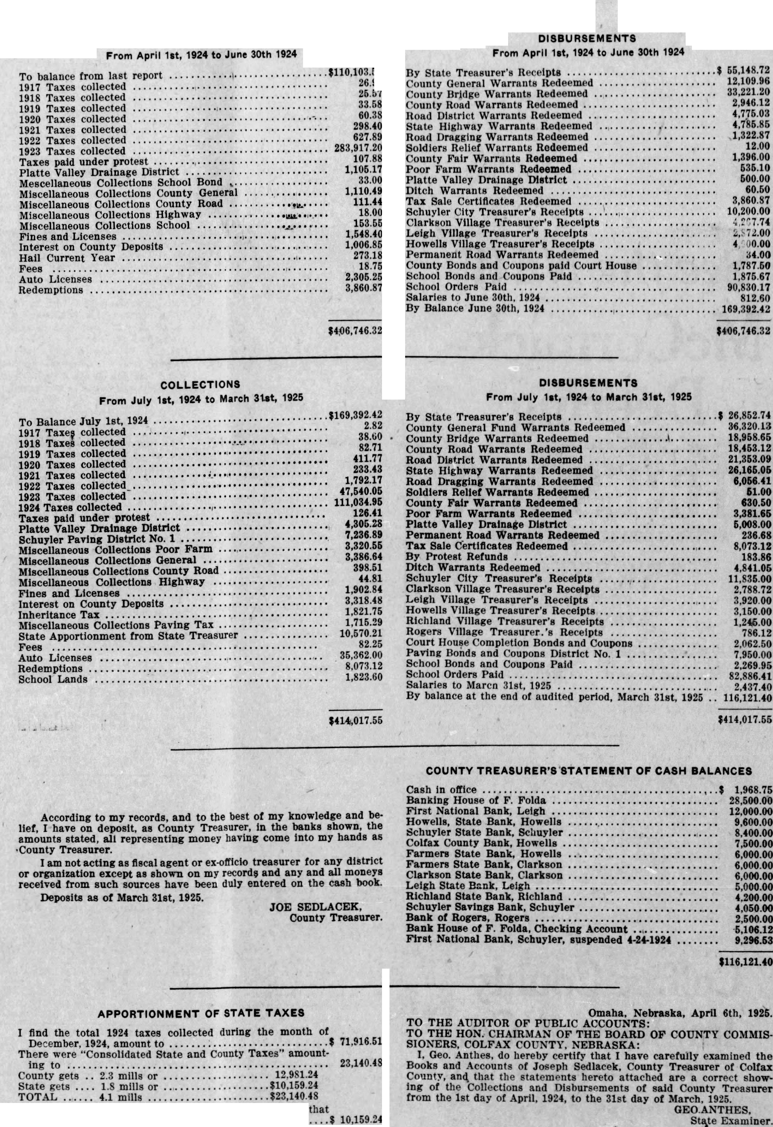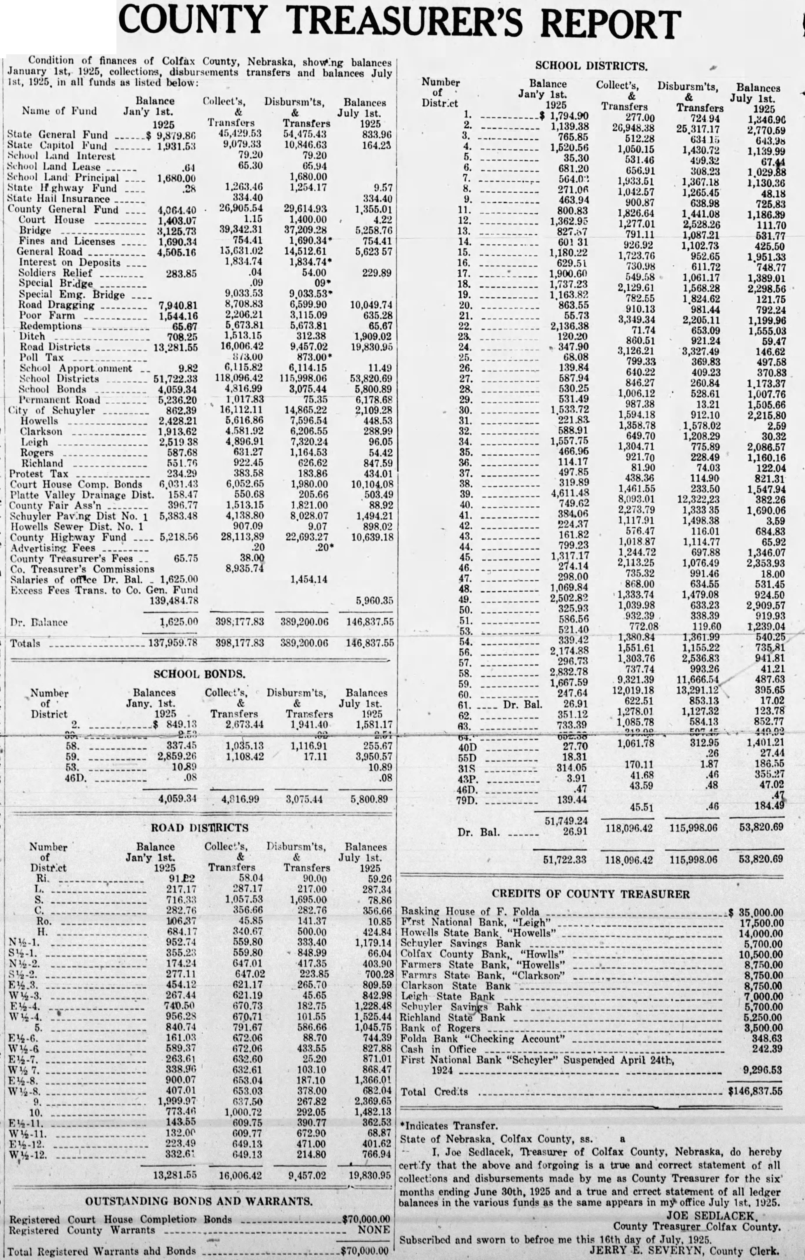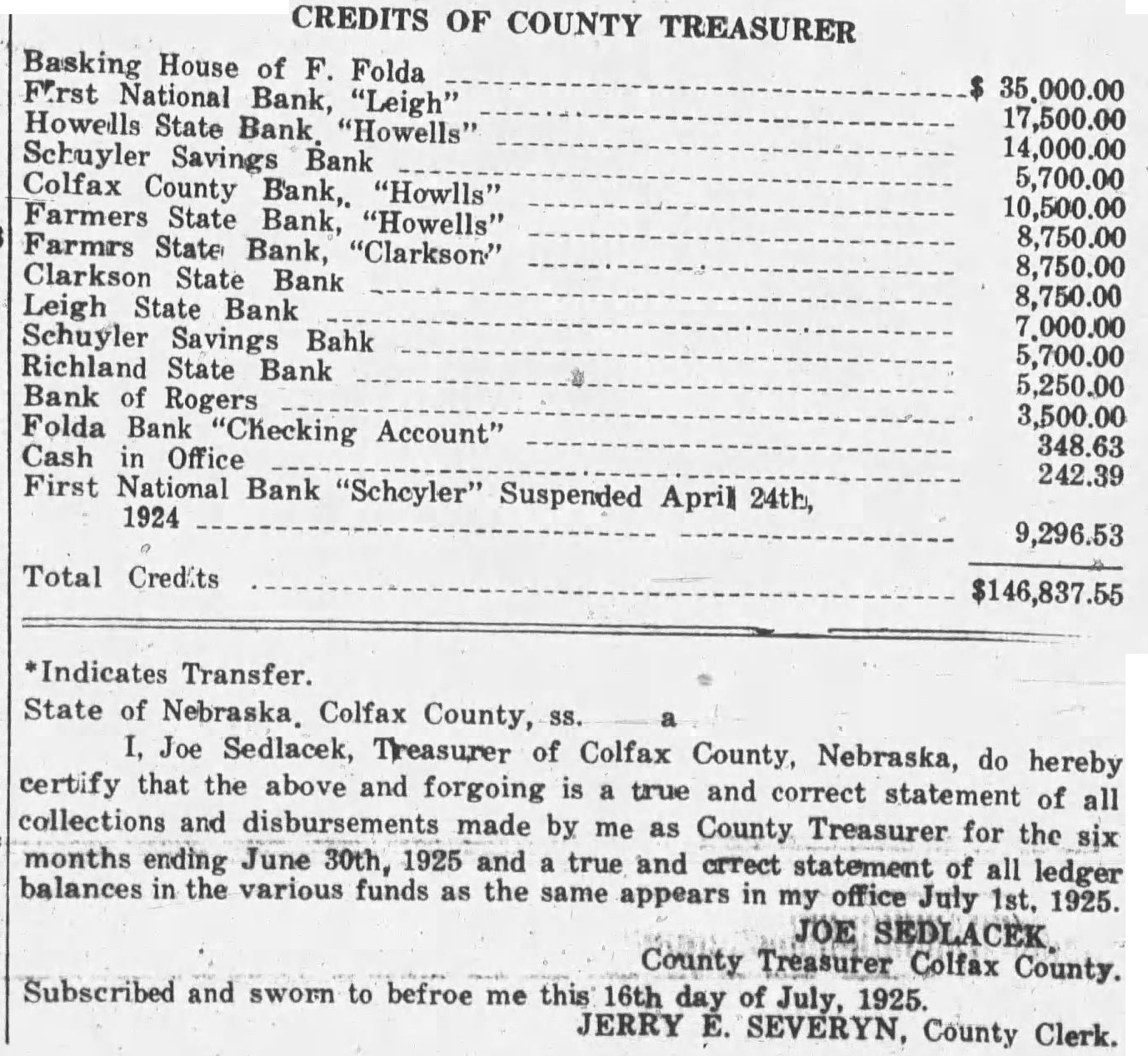 to be read on thre separate days be suspended, and ordinance No 108 be to its second reading. Voting passed yes, Costello, Chase, Krejci, Otradovsky, Pavlicek and Sprecher. Ordinance No. 108 was read the second time. Moved by Chase, seconded by Krejci that the rules requiring an ordinance to be read on three separate days be suspended, and that Ordinance No. 108 be passed to its third reading Voting Costello, Chase, Otradovsky, Pavlicek, Krejci and Sprecher. Ordinance No. 108 was read the third time. Moved by Pavlicek and seconded by Chase that Ordinance No. 108 as read be passed, approved and published as by law required. Voting yes, Costello, Chase, Krejci, Otradovsky, Pavlicek and Resolution fixing amounts of special assessments according to benefits introduced by Councilman Otradovsky. Voting yes, Costello, Chase Krejci, Otradovsky and Pavlicek. Voting no, Sprecher. The mayor declared the motion carried. by Costello, seconded by Moved that bid of the Omaha Otradovsky, Printing Co. for vault fixtures be accepted. Votig yes, Costello, Chase, Otradovsky ,Pavlicek and Krejci, Sprecher. Moved by Chase, seconded by Cos. tello, that bids received on oil engines after the specified time be opened. All councilmen present voting, yes. This being the date set for receiving bids on oil engines, the following submitted bids: Fairbanks Morse Co., Bessemer Gas Engine Co., Worthington Pump & Machinery Corporation. Moved by Costello, seconded by Chase that the bids submitted on oil engines be held open for further consideration. Voting yes, Costello, Chase and Otradovsky. Voting no, Krejci, and Sprecher. Upon motion the council adjourned. GEO. McKENZIE, City Clerk. Approved: EDW. W. ZERZAN, Mayor. Neb., Feb. 3, 1925. Schuyler, The city council met in regular session, Mayor Edw. W. Zerzan, presiding. The following councilmen were present: Costello, Chase, Krejci, Otradovsky, Pavlicek and Sprecher. Minutes of the previous meeting were read and approved. Moved by by Krejci, that the city clerk be authorized to issue warrant to the county in the amount of treasurer the balance in the disrepresenting trict No. paving (sinking fund), betransferred to the above treasurer retirement of bonds. All counfor the cilmen present voting, yes. Report of McKenzie, chief of read and placed on file. police, was Moved by Krejci, seconded by Otradovsky that the report of the city treasurer be referred to the Finance committee. All councilmen present voting yes. Following claims against the city were read: Western Electric,. supplies Cornell Supply Co., supplies, $4.29; The McGrau Co., supplies, $5.75; In. terstate Machinery & Supply Co., supplies, Granden Electric Co., supplies, Jos. Zelenda, labor, $57.89; Lion Cola Co., $326.10; Union Pacific R. R. Co., freight, The Korsemeyer Co., supplies, $113.12; Kopac Brothers, supplies, $3.35; Kopac Bros., supplies, Landers, Frary Clark, supplies, $2.00; Sundry Cach, City Water Dept., power house, flushing sewers, $125.00; rent of hydrants, $375.00 The Albert Sech rist Mfg. Co., supplies, $10.75; Kopac Bros., supplies, $10.00; Western Electric, supplies, Salak, dray $12.00; Smatlan Bros, fuel, Anton Bartunek, special police duty, $7.00; Fulmer Bros., dray, $38.10; Geo. Prince, expenses of trip to CchuyAlfred Messman, labor, Alvin Messman, labor, Biggs & Son, $2.25; Bell Tel. Co., dray, phone rental and toll,, Browder Co., repairs, etc., $6.10; Eack Motor Co., repairs, $3.75; Heck Bastian Electrical Works, pairs, $10.00; Johnson Boiler Co., labor etc., $40.29; W. Daniels, labor, City Light Water Works, Power, Street Light, $355.56; Standard Oil Co., gas, Neptune Meter repairs, $12.24; Valvoline Oil Co., supplies, General Electric Co., repairs, $24.75; Schuyler Oil Co., gas, $7.28; Deep Rock Oil Cq., gas and alcohol, Schuyler Auto Co., repairs, Mid-west Top Electric Co., supplies, $3.55; HigginsCoufal, supplies, $131.65; Enterprise Electric Co., supplies, $78.95; Glasco Electric supplies, $8.92; W. Bell Tel. Co., attachments, rental, Moved by Krejci and seconded by Pavlicek that the bills be referred to the finance committee and that warrants be drawn in payment those bearing their K. All councilmen voting yes. Moved by Sprecher, seconded by Pavlicek that all bids received on oil engines on the date of Jan. 23, 1925, be rejected. Voting yes, Costello, Krejci, Otradovsky, Pavlicek and Sprecher. Voting no, Chase. Whereupon the mayor declared the motion carried. Upon motion the council adjourned. GEO. F. McKENZIE, City Clerk. Approved: EDW. W. ZERZAN, Mayor. Schuyler, Neb., Jan. 28, 1925. The city council met in special sion, Mayor Edw. W. Zerzan, presiding. Following councilmen were present: Costello, Chase, Krejci, Otradovsky, Pavlicek and Sprecher. Moved by Otradovsky, seconded by Krejci, that the city adopt the following agree- THIS AGREEMENT made and tered into this 28th day of January, 1925, by and between Herman Johns, Chaplin, W. W. Pollard, H. Callaghan, Jess L. Woods, Kovar, Pokorny, R. Folken and Killeen, parties of the first and the city of Schuyler, Colfax county, Nebraska, as parties of the second part ALL OF THE PARTIES hereto ulate and agree in consideration of the mutual undertakings of each, that the agreements between the foregoing parties made and entered into on the 6th day of January, 1925, be and the same hereby in all respects rescinded and Dated this 28th day of January, 1923. Chaplin. Folken. Herman Johns. S. Pokorny. Kovar H. O'Callaghan. W. W. Pollard. Jess L. Woods. Voting yes, Costello, Chase, Krejci, Otradovsky, Pavlicek and Sprecher. Voting no, none. Whereupon the mayor declared the motion carried. The following resolution was introduced Councilman Krejci who moved its adoption: WHEREAS, the city of Schuyler, Colfax county, Nebraska, did, (pursuant to an ordinance of said city authorizing same, and relying on the truthfulness of the statements contained in the published reports and statements said bank, prior to May 1, 1923, which statements and reports