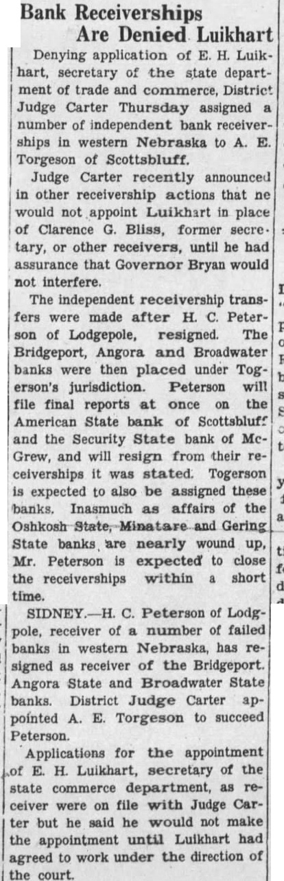 Bank Receiverships Are Denied Luikhart Denying application of Luikhart, secretary of the state department of trade and commerce, District Judge Carter Thursday assigned number of independent bank receiverships in western Nebraska to Torgeson of Scottsbluff. Judge Carter recently announced in other receivership actions that ne would not appoint Luikhart in place of Clarence Bliss, former secre. tary, or other receivers, until he had assurance that Governor would not interfere. The independent receivership transfers were made after H. Peterof Lodgepole, resigned. The Bridgeport, Angora and Broadwater banks were then placed under Togerson's jurisdiction. Peterson will file final reports at once on the American State bank of Scottsbluff and the Security State bank of McGrew, and will resign from their ceiverships was stated. Togerson expected to also be assigned these banks. Inasmuch as affairs of the Oshkosh Gering State banks are nearly wound up, Mr. Peterson is expected to close the receiverships within short time. Peterson of Lodgpole, receiver of number of failed banks in western Nebraska, has signed as receiver of the Bridgeport. Angora State and Broadwater State banks. District Judge Carter pointed E. Torgeson to succeed Peterson. Applications for the appointment H. Luikhart, secretary of the state commerce department, as receiver were on file with Judge Carter but he said he would not make the until Luikhart had appointment agreed to work under the direction of the court.
