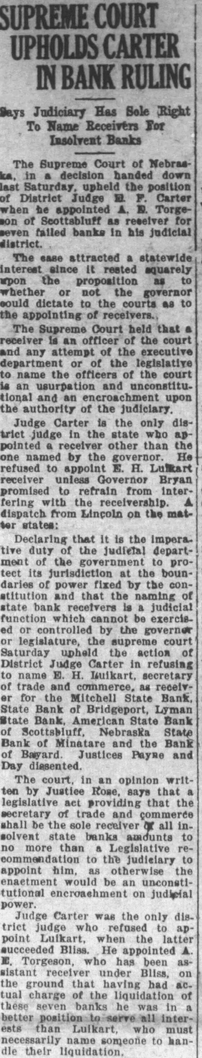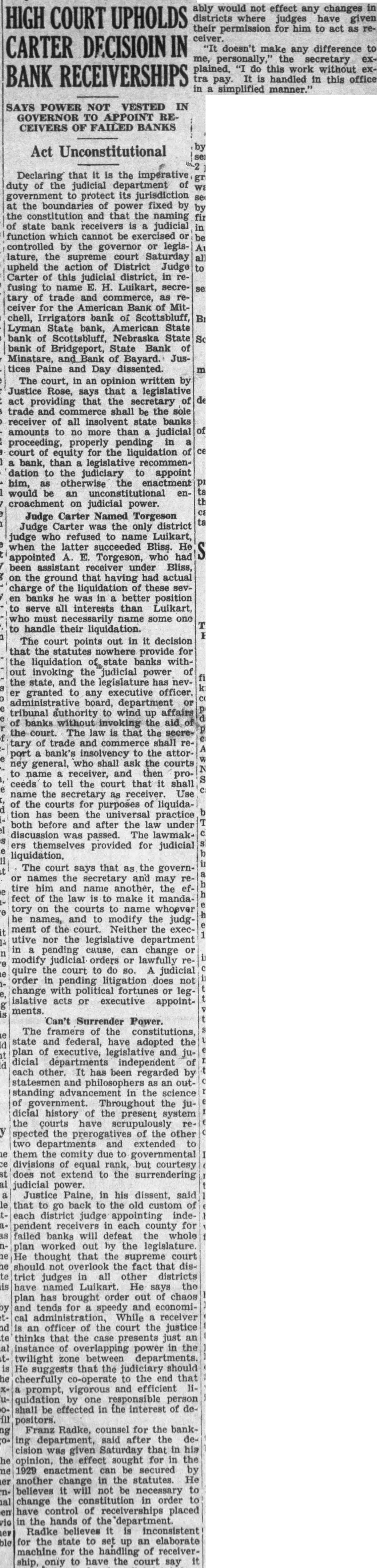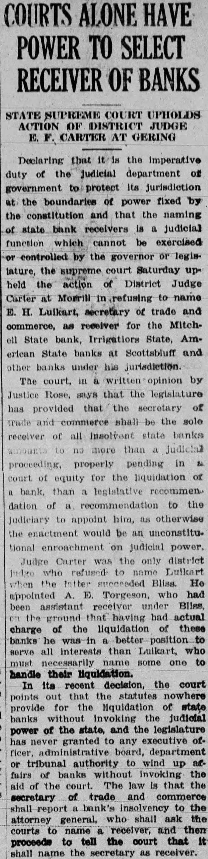 COURTS ALONE HAVE POWER TO SELECT RECEIVER OF BANKS STATE SUPREME COURT UPHOLDS ACTION OF DISTRICT JUDGE E. F. CARTER AT GERING Declaring that the imperative duty of the Judicial department of government to protect its jurisdiction at the boundaries of power fixed by the constitution and that the naming of state bank receivers is a judicial function which cannot be exercised or controlled by the governor or legislature, the supreme court Saturday upheld the action of District Judge Carter at Morrill ingrefusing to name E. H. Luikart, secretary of trade and commerce, as receiver for the Mitchell State bank, Irrigations State, American State banks at Scottsbluff and other banks under his jurisdiction. The court, in a written opinion by Justice Rose, says that the legislature has provided that the secretary of trade and commerce shall be the sole receiver of all insolvent state banks amounts to no more than a judicial proceeding, properly pending in & court of equity for the liquidation of a bank. than a legislative recommen. dation of a. recommendation to the judiciary to appoint him, as otherwise the enactment would be an unconstitutional enroachment on judicial power. Judge Carter was the only district Indge who refused to name Luikart when the Intter succeeded Bliss. He appointed A. E. Torgeson, who had been assistant receiver under Bliss. the ground that having had actual charge of the liquidation of these banks he was in better position to serve all interests than Luikart, who must necessarily name some one to handle their liquidation. In its recent decision, the court points out that the statutes nowhere provide for the Hquidation of state banks without invoking the judicial power of the state, and the legislature has never granted to any executive officer, administrative board, department or tribunal authority to wind up arfairs of banks without invoking the aid of the court. The law is that the secretary of trade and commerce shall report a bank's insolvency to the attorney general, who shall ask the courts to name a receiver, and then proceeds to tell the court that it shall name the secretary as receiver.