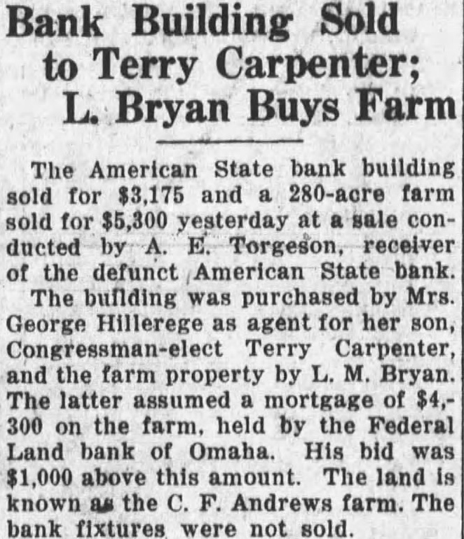 Bank Building Sold to Terry Carpenter; L. Bryan Buys Farm The American State bank building sold for $3,175 and 280-acre farm sold for $5,300 yesterday at conducted Torgeson, receiver of the defunct American State bank. The building was purchased by Mrs. George Hillerege agent for her son, Terry Carpenter, and the farm property by Bryan. The latter assumed mortgage of 300 the farm. held by the Federal Land bank of Omaha His bid was above this amount. The land known the Andrews farm. The bank fixtures were not sold.