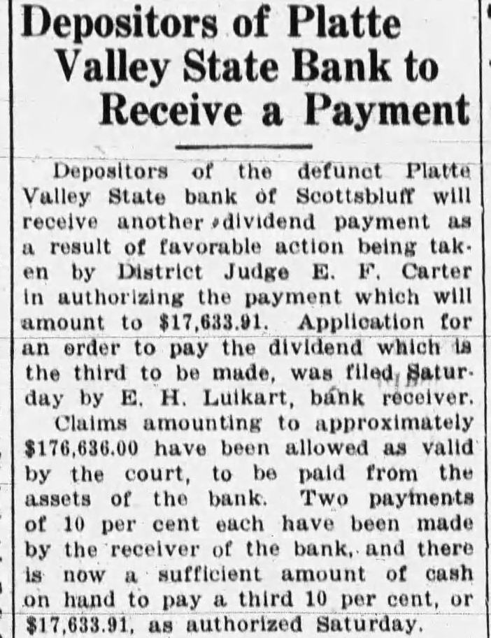 Depositors of Platte Valley State Bank to Receive a Payment Depositors the defunct Platte Valley State bank Scottsbluff will receive payment result of favorable being tak by District Judge Carter authorizing the payment which will amount Application order to pay the dividend which the third made, Satur by Luikart, bank receiver. Claims have been allowed valid by the court, paid from the assets the bank. Two payments cent each have been made by the the bank. and there now sufficient amount of cash hand pay third per cent, or as authorized