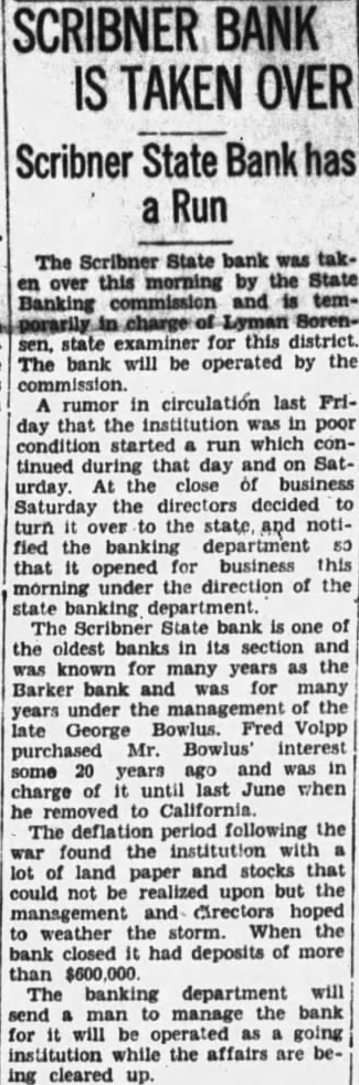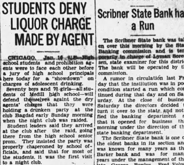 STUDENTS DENY LIQUOR CHARGE MADE Sorenag- sen, state for this district. ents were to face each other before The bank will be operated by the jury of high school principals here today for on rumor in circulation last Fricharges drinking. day that the institution was poor Seventy boys and started run which condents Medill high tinued during that day and on Satdefend themselves againt the dry At the close of business urday. agents' charges that they Saturday the decided holding drunken party at turn to the state, and noticlub early Sunday morning fied the department when the night club raided. that opened business this Student leaders said they arrived under the direction of the at the club after raid, going banking there from the high school senior The Scribner State bank is one of prom. They insisted the party the oldest banks in its section and properly school known for years as the many ficials, and said that for most Barker bank and for many the students. was the first visit under the of the night club. George Bowlus. Fred Volpp