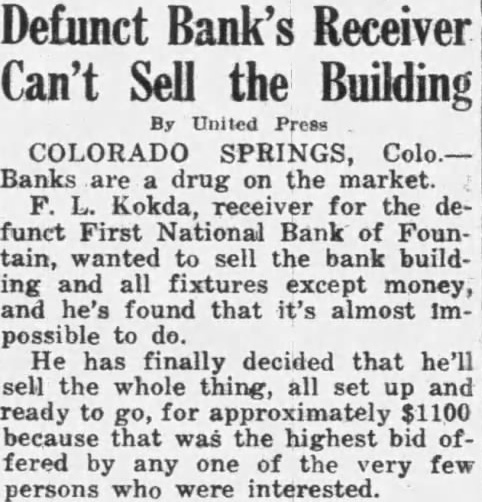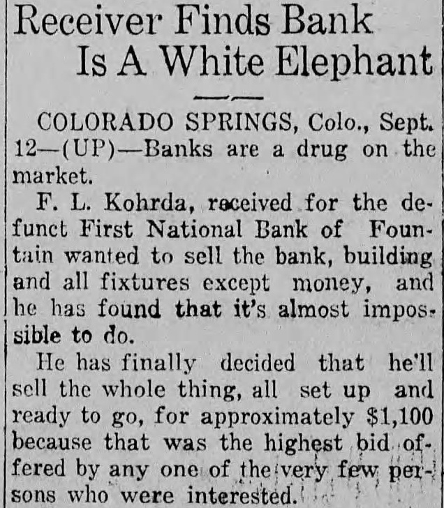 Receiver Finds Bank Is A White Elephant COLORADO SPRINGS, Colo., Sept. -(UP)-Banks are a drug on the market. F. L. Kohrda, received for the defunct First National Bank of Fountain wanted sell the bank, building and all fixtures except money, and he has found that it's almost impossible to do. He has finally decided that he'll sell the whole thing, all set up and ready to go, for approximately $1,100 because that was the highest bid offered by any one of the very few persons who were interested.