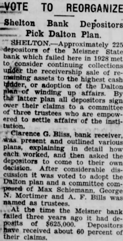 200 BANK DEPOSITORS ASK LEGISLATIVE AUDIT Shelton Residents Have Received Two Dividends from Failed Institution. WANT ASSURANCES Special Dispatch to The World Herald Shelton, Neb., Feb. Petitions signed by upwards of 200 local depositors in the Meisner State bank, which failed here in September, 1927, requesting a thor ough investigation of the guaranty fund, have been forwarded to Senator Kenneth Wherry, governor Weaver. Senator John Bowman and Representative F. A. Mueller The petition avers that depositors want assurance that the local bank and other failed institutions have been operated in the best interests of the depositors. The last statement of the Mesiner bank before the institution was taken over by the commission showed deposits of more than 660 thousand dollars. Local depositors have received two dividends, one of 36 per cent and one of 12 per cent. Depositors are planning to hold a meeting here Saturday night, February 16, to organize for an in vestigation of settlements which have been made in closing the bank's affairs.