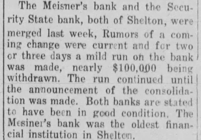 The Meisner's bank and the Security State bank, both of Shelton, were merged last week, Rumors of a coming change were current and for two or three days mild run on the bank was made, nearly $100,000 being withdrawn. The run continued until the announcement of the consolidation was made. Both banks are stated to have been in good condition. The Mesiner's bank was the oldest financial institution in Shelton.