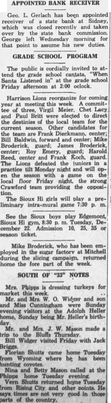 APPOINTED BANK RECEIVER Geo. Gerlach has been appointed receiver of state bank Sidney, which closed recently and taken by the state bank commission. Wednesday morning for George that point assume his duties. GRADE SCHOOL PROGRAM The public cordially invited to tend the grade school cantata, Santa Listened the grade Friday afternoon 2:00 oclock. Harrison Lions reorganize for coming this week. tee Virgil Chet Lacy and Paul Britt elected direct the destinies local team for the current Other candidates for the team are Frank Dieckmann, center; Bill Baldwin, forward and center; Mike Broderick, guard; James Broderick, center; Roy Emery, guard; Harold Reed, center and Frank Koch, guard. Lions defeated the juniors in practice tilt Monday night will the game local floor Friday night, the strong Crawford team providing the opposiThe Sioux Hi girls will play preliminary intra-mural game See the Sioux boys play Edgemont, Sioux Hi 8:30 Tuesday, cember Admission 35 ticket. Mike Broderick, who has been employed factorv Mitchell sugar during the slicing campaign, returned home the fore part of the week. SOUTH OF Mrs. Phipps dressing turkeys for this and Mrs. Widger and and Miss Cunningham Sunday evening visitors the Adolph Heller home, Sunday being Mr. Heller's birthand Mrs. Mason made the Bluffs Thursday. Bill Widger visited Friday with Jack Briggs. Florian Shutts came home Tuesday from where he has been hunting coyotes. Nina Betty Mason called at the Phipps home Tuesday evening. Shutts returned home Tuesday from Rising City and other points. not very good those the country.