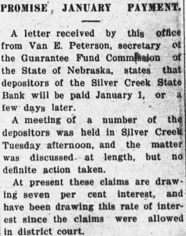 Lightner Orders Guarantee Fund to Pay for Silver Creek Bank of the failed Silver Depositors Creek state bank, who since 1924 have waited for their money, may have check from the state guarantee fund in time to be included in the list of good things Christmas. Last Friday, December 16, District Judge Louis Lightner issued order authorizing the payment to the bank receiver for paying all claims allowed. is understood that actual payment entirely possible before Christmas. Quite little interest noted the case, in some measto the magnitude of the loss represented by the total of claims. Following are the judge's notes: In case entitled: State of Nebraska, rel, Spillman, Attorney General plaintiff, vs. Silver Creek State Bank, Silver Creek, Nebraska, Under date of December 16, 1927, the Hon. Louis Lightner, district judge in and for Merrick county, Nebraska, signed an order determining deficiency and causing same certified which in part: therefore, hereby ordered, judged and decreed that the amount required to be drawn from the Depositor's Fund of the State Nebraska to supply the deficiency to the claims which required pay heretofore allowed and paid Hundred Hundred Dollars and Forty Cents that said amount shall drawn from the Depositor's Guaranty Fund of the State of Nebraska the of Department Trade and Commerce turned the receiver this bank for the of paying claims; purpose that upon receipt of amount shall pay said claims heretofore by this court; that the clerk of this court forthwith mit to the secretary of the departrade and of the State Nebraska certified copy of this