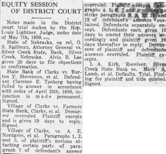 EQUITY SESSION OF DISTRICT COURT Notes made in the District court trial docket by the Louis Lightner. Judge, under date of May 7th, State Nebraska, rel, ex Spillman, Attorney General Silver Creek State, Bank, Silver Creek, Nebraska. Alvin B. Lee given 20 days to file obpections confirmation. State Bank of Clarks VS. Burton Stevenson, Defendant Clarence E. Tanborg having failed to answer accordance with order of April 25th, 1930, junction is permanent. Signed. Village of Clarks Farmers State Bank, Clarks, Demurrer overruled. Plaintiff excepts and given 10 days to reply. Signed. Village of Clarks, Nordgren, et al. Paragraphs and of plaintiff's motions taching certain parts of paraof defendant's answer overruled. graphs strike paragraphs defendant's answers tained. Defendants separately cept. Defendants each given 10 days to amend their answers cordingly and plaintiff given days thereafter reply. Demurof plaintiff and defendants answers overruled. Plaintiff cepts. Kirk, Receiver, Silver Creek State Bank Mark Lamb, Defaults. Trial. Finding for plaintiff and title quieted. Signed.