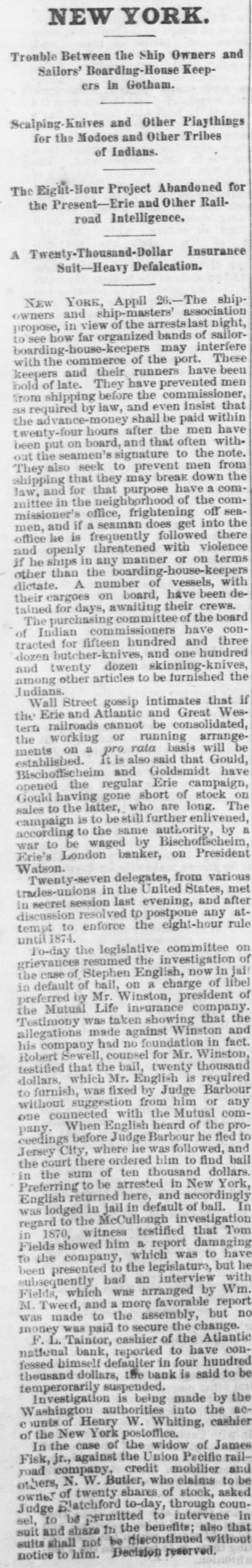 Heavy Defalcation in the Atlantic National Bank. Just as Wall street was about putting up the shutters yesterday a rumor got rapid circulation that the Atlantic National Bank, an institution of moderate activity and fair reputation, having its counting house in Nassau street, nearly opposite the Post Office, had been compelled to suspend. In this respect the rumor was literally an untruth, at least for the day, as the Bank, desperately defying the fate which circumstances afterward proved must be inevitable, paid every dollar demanded of it until the arrival of the hour of three o'clock, when it legally closed its doors, as it could, against all claimants for the day. The trouble is the old story of stock speculation by the cashier and a defalcation in his accounts, the amount involved in this instance being nearly half a million. A curious feature of the affair is the deliberate conduct of the cashier in disclosing his "misdeeds. With a frankness which, under the circumstances, would almost argue the loss of the man's wits, he proceeded to the Clearing House, of which the Bank was a member, and coolly requested an investigation of his books and an examination of the Bank's affairs, stating at the same time that he was a defaulter in his cash account. A committee of the Clearing House acceded to his request, and, as a result of their labors, it was announced last evening that the institution was bankrupt and would not be able to resume on Monday. The facts were telegraphed to the Comptroller of the Currency, who has ordered the appointment of a receiver. In one sense, therefore, the Bank has failed, and in another it has not. It was open and paid all claims up to three o'clock yesterday. But the interval to ten o'clock Monday morning is a legal holiday for the Bank, so that the action of the Comptroller of the Currency looks upon the face of it as if he had appointed a receiver without sufficient legal reason. This controversy aside, the defalcation of the cashier comes as a sermon full of point this Spring Sunday, when our several hundred metropolitan congregations run their eyes over the decalogue at church this morning and read its included command, "Thou shalt not steal." The Atlantic National Bank, as its name implies, was of the national system, and only a few weeks ago made its sworn statement of assets and liabilities. The fact evokes another inquiry, Who was it that broke the other commandment, "Thou shalt not bear false witness," and how many more of the decalogue were broken in this same crime of defalcation?