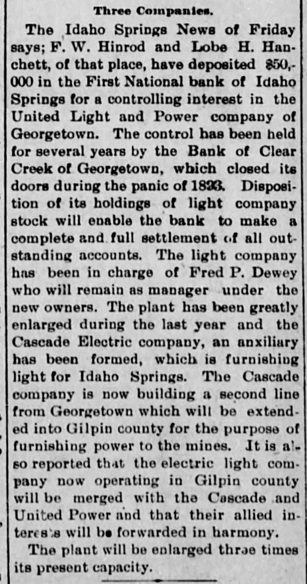 Three Companies. The Idaho Springs News of Friday says; F. W. Hinrod and Lobe H. Hanchett, of that place, have deposited 850,000 in the First National bank of Idaho Springs for a controlling interest in the United Light and Power company of Georgetown. The control has been held for several years by the Bank of Clear Creek of Georgetown, which closed its doors during the panic of 1823. Disposition of its holdings of light company stock will enable the bank to make a complete and full settlement of all outstanding accounts. The light company has been in charge of Fred P. Dewey who will remain as manager under the new owners. The plant has been greatly enlarged during the last year and the Cascade Electric company, an anxiliary has been formed, which is furnishing light for Idaho Springs. The Cascade company is now building a second line from Georgetown which will be extended into Gilpin county for the purpose of furnishing power to the mines. It is also reported that the electric light company now operating in Gilpin county will be merged with the Cascade and United Power and that their allied interes's will be forwarded in harmony. The plant will be enlarged thrae times its present capacity.