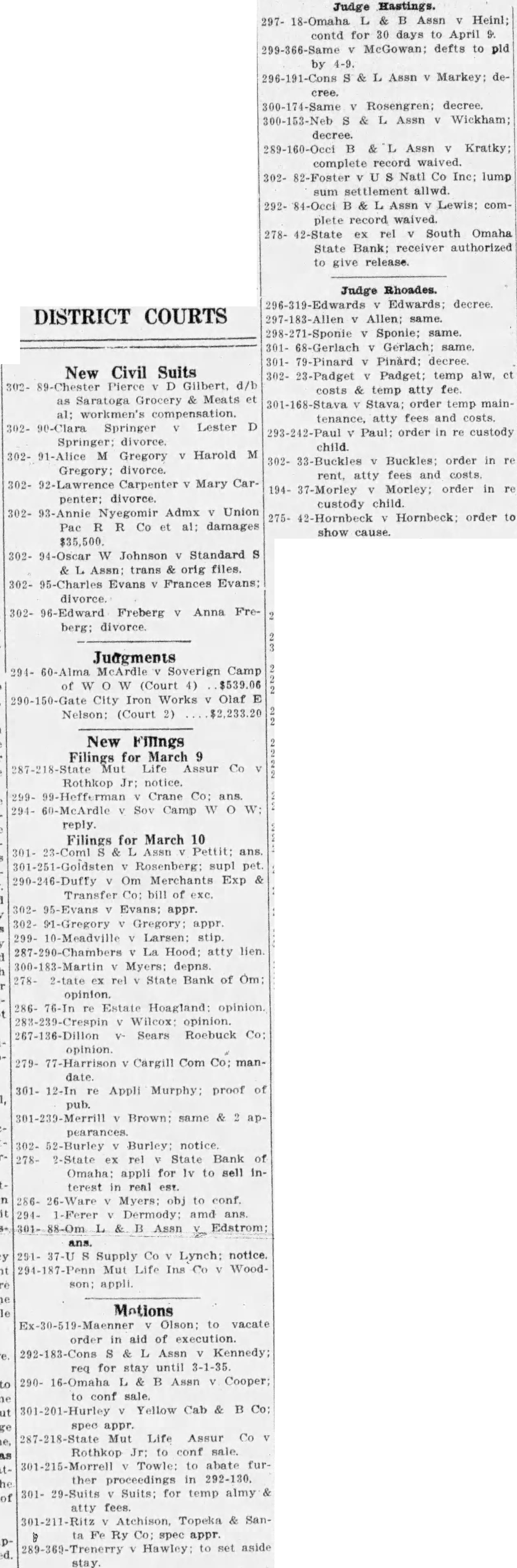 DISTRICT COURTS New Civil Suits Saratoga Grocery Meats et al: workmen's compensation. 302- 90-Clara Springer Lester D Springer: divorce 302- 91-Alice M Gregory Harold M Gregory: divorce. 302- 92-Lawrence Carpenter Mary Carpenter: divorce. 302- 93-Annie Nyegomir Admx Union Pac R R Co et al; damages 302- 94-Oscar W Johnson Standard S Assn: trans orig files. 302- 95-Charles Evans Frances Evans: divorce. 302- 96-Edward Freberg Anna Freberg: divorce. Judgments 294- 60-Alma Camp of W W (Court 4) $539.06 290 City Iron Works Olaf E Nelson: (Court 2) New Fillings Filings for March 9 Life Assur Co Rothkop Jr: notice. 299 Crane Co: ans 294- Sov Camp W O W: reply. Filings for March 10 301 23-Coml Pettit: ans 251-Goldsten Rosenberg: supl pet 290-246-Duffy Om Merchants Exp Transfer bill 95-Evans Evans: appr 302. 91-Gregory Gregory appr 299 -Meadville Larsen: stip. La Hood atty lien Myers: depns 278 2-tate rel Bank of Om 286- 76-In Estate Hoagland opinion 267-136-Dillon Sears Roebuck Co: opinion 279- Harrison Cargill Com Co: mandate 301- 12-In re Appli Murphy: proof of 301-233-Merrill Brown: same & 2 appearances 302- 52-Burley notice 278- ?-State State Bank of ex appli for Iv to sell Inreal est. 286- 26-Ware Myers: obj to conf. 294- amd 301- 88-Om L & B Assn y - Edstrom: 291- Supply Co Lynch: notice Penn Mut Life Ins Woodson: Motions Ex Olson: to vacate order in aid of execution. 292-183-Cons S Assn Kennedy: req for stay until 3-1-35 290- 16-Omaha & B Assn Cooper: 301-201-Hurley Yellow Cab & B Co: appr. 287-218-State Mut Life Assur Co Rothkop conf sale. 301-215-Morrell Towle to abate fur ther proceedings in 292-130. 301- 29-Suits Suits: for temp almy fees. 301-211-Ritz Topeka & San Fe Ry Co: spec appr Hawley set aside Judge Hastings. 297- & Assn Heinl; contd for 30 days to April 299 McGowan: defts to pid by 4-9. 296-191-Cons & L Assn Markey: de174-Same Rosengren: decree. 300-153-Neb S & L Assn Wickham: decree 289 160-Occi B & L Assn Kratky complete record waived 302- 82-Foster Natl Co Inc: lump 292- 84-Occi Assn Lewis: complete record waived 278- 42-State ex rel South Omaha State Bank; receiver authorized to give release Judge Rhoades 296-319-Edwards Edwards: decree 297-183-Allen Allen: same. 298-271-Sponie Sponie: 301- 68-Gerlach Gerlach: same 301- 79 Pinard Pinard: 302- 23-Padget Padget: temp alw. ct & temp atty fee 301-168-Stava Stava: order and 293-242-Paul Paul: order in re custody 302- 33-Buckles Buckles: order in re atty fees and costs 194- 37-Morley Morley order in re custody child 275- 42- Hornbeck Hornbeck: order to