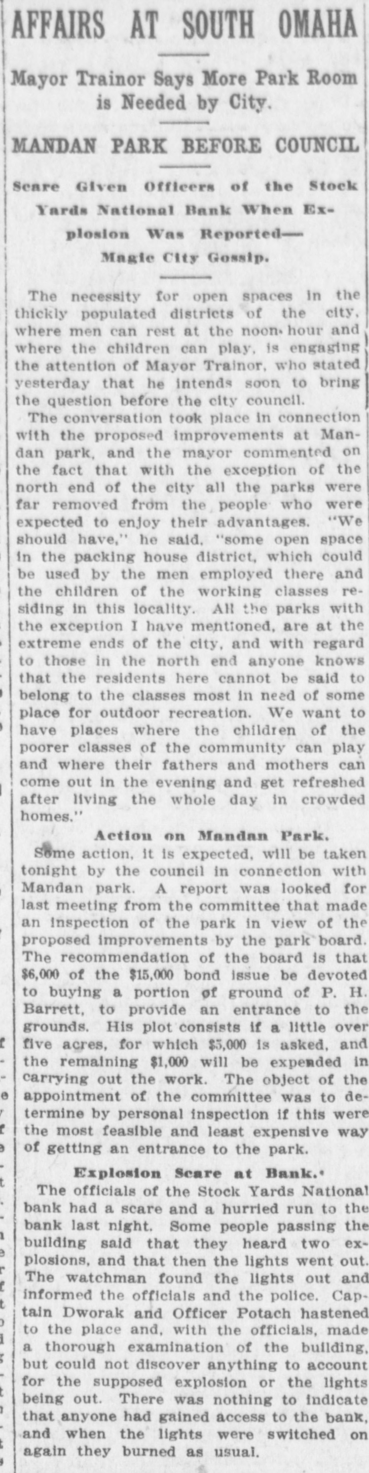 AFFAIRS AT SOUTH OMAHA Mayor Trainor Says More Park Room is Needed by City. MANDAN PARK BEFORE COUNCIL Scare Given Officers of the Stock Yards National Bank When Explosion Was Reported— Magic City Gossip. The necessity for open spaces in the thickly populated districts of the city, where men can rest at the noon. hour and where the children can play, is engaging the attention of Mayor Trainor, who stated yesterday that he intends soon to bring the question before the city council. The conversation took place in connection with the proposed improvements at Mandan park, and the mayor commented on the fact that with the exception of the north end of the city all the parks were far removed from the people who were expected to enjoy their advantages. "We should have," he said. "some open space in the packing house district, which could be used by the men employed there and the children of the working classes residing in this locality. All the parks with the exception I have mentioned, are at the extreme ends of the city, and with regard to those in the north end anyone knows that the residents here cannot be said to belong to the classes most in need of some place for outdoor recreation. We want to have places where the children of the poorer classes of the community can play and where their fathers and mothers can come out in the evening and get refreshed after living the whole day in crowded homes." Action on Mandan Park. Some action, it is expected, will be taken tonight by the council in connection with Mandan park. A report was looked for last meeting from the committee that made an inspection of the park in view of the proposed improvements by the park board. The recommendation of the board is that $6,000 of the $15,000 bond issue be devoted to buying a portion of ground of P. H. Barrett, to provide an entrance to the grounds. His plot consists if a little over five acres, for which $5,000 is asked, and the remaining $1,000 will be expended in carrying out the work. The object of the appointment of the committee was to determine by personal inspection if this were the most feasible and least expensive way of getting an entrance to the park. Explosion Scare at Bank.' The officials of the Stock Yards National bank had a scare and a hurried run to the bank last night. Some people passing the building said that they heard two explosions, and that then the lights went out. The watchman found the lights out and informed the officials and the police. Captain Dworak and Officer Potach hastened to the place and, with the officials, made a thorough examination of the building, but could not discover anything to account for the supposed explosion or the lights being out. There was nothing to indicate that anyone had gained access to the bank, and when the lights were switched on again they burned as usual.