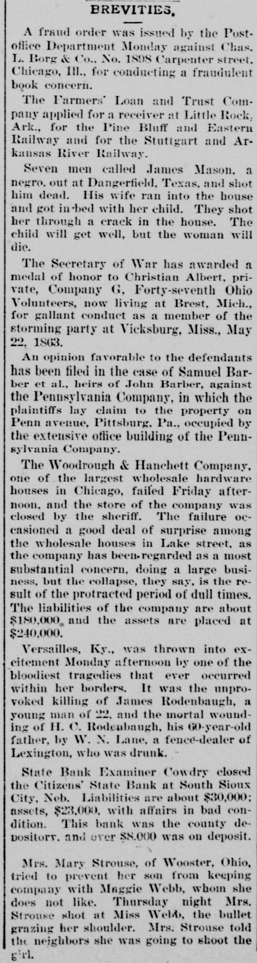BREVITIES, A fraud order was issued by the Postoffice Department Monday against Chas. L. Borg & Co., No. 1898 Carpenter street, Chicago, Ill., for conducting a fraudulent book concern. The Farmers' Loan and Trust Company applied for a receiver at Little Rock, Ark., for the Pine Bluff and Eastern Railway and for the Stuttgart and Arkansas River Railway. Seven men called James Mason. a negro, out at Dangerfield, Texas, and shot him dead. His wife ran into the house and got in-bed with her child. They shot her through a crack in the house. The child will get well, but the woman will die. The Secretary of War has awarded a medal of honor to Christian Albert, private, Company G. Forty-seventh Ohio Volunteers, now living at Brest, Mich., for gallant conduct as a member of the storming party at Vicksburg, Miss., May 22. 1863. An opinion favorable to the defendants has been filed in the case of Samuel Barber et al., heirs of John Barber, against the Pennsylvania Company, in which the plaintiffs lay claim to the property on Penn avenue, Pittsburg, Pa., occupied by the extensive office building of the Pennsylvania Company. The Woodrough & Hanchett Company, one of the largest wholesale hardware houses in Chicago, failed Friday afternoon, and the store of the company was closed by the sheriff. The failure occasioned a good deal of surprise among the wholesale houses in Lake street, as the company has been-regarded as a most substantial concern, doing a large business, but the collapse, they say, is the result of the protracted period of dull times. The liabilities of the company are about $180,000. and the assets are placed at $240,000. Versailles, Ky., was thrown into exeitement Monday afternoon by one of the bloodiest tragedies that ever occurred within her borders. It was the unprovoked killing of James Rodenbaugh, a young man of 22. and the mortal wounding of H. C. Rodenbaugh, his 60-year-old father, by W. N. Lane, a fence-dealer of Lexington, who was drunk. State Bank Examiner Cowdry closed the Citizens' State Bank at South Sioux City, Neb. Liabilities are about $30,000; assets, $23,000, with affairs in bad condition. This bank was the county depository. and over $8.000 was on deposit. Mrs. Mary Strouse, of Wooster, Ohio, tried to prevent her son from keeping company with Maggie Webb, whom she does not like. Thursday night Mrs. Strouse shot at Miss Webb, the bullet grazing her shoulder. Mrs. Strouse told the neighbors she was going to shoot the girl.