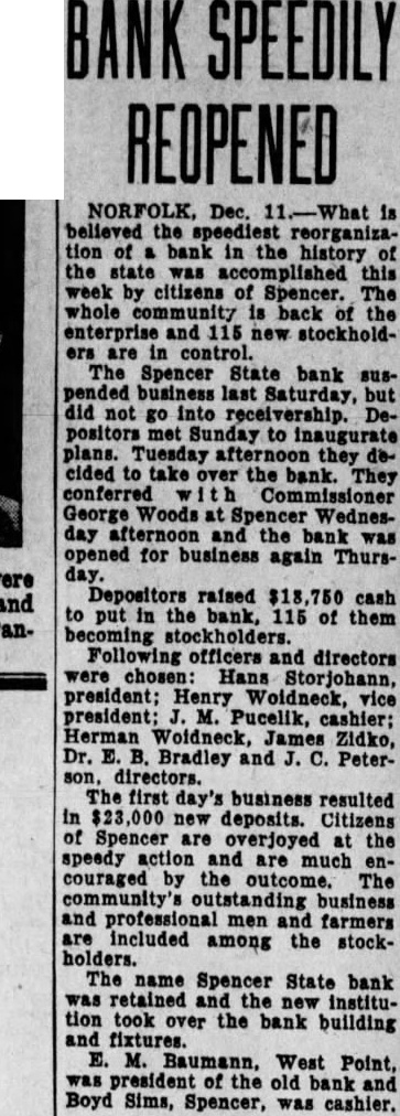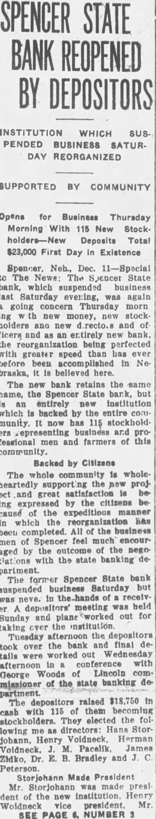 SPENCER STATE REOPENED BY DEPOSITORS INSTITUTION WHICH PENDED BUSINESS SATURDAY REORGANIZED SUPPORTED BY COMMUNITY Opens for Business Thursday Morning With 115 New StockDeposits Total $23,000 First Day in Existence Spencer, Neb., Dec. The News: The Spencer State bank, which suspended business last Saturday evening, again going Thursday morn new money, stockholders ano and of ficers and entirely bank, the reorganization being perfected with speed than has before accomplished in Nebraska, believed here. The new bank retains the same name, Spencer State but entirely institution which backed by the entire munity. now has 115 business and fessional men and farmers of this community. Backed by Citizens The whole community wholeheartedly the projgreat satisfaction by the citizens cause of the expeditious which the has completed. the business of Spencer feel much encouraged by the outcome the with the state banking department. Spencer State bank The former business Saturday but suspended of meeting held depositors' and out for Sunday institution Tuesday afternoon the depositors over the bank and final worked out Wednesday conference with Woods of Lincoln George the state banking The depositors raised 115 them stockholders. They elected the lowing directors: Storjohann, Henry Herman Pacelik, James Voidneck, Zidko, Dr. Bradley and Peterson. Storjohann Made President Storjohann the new institution. Henry Woldneck vice president. SEE PAGE NUMBER