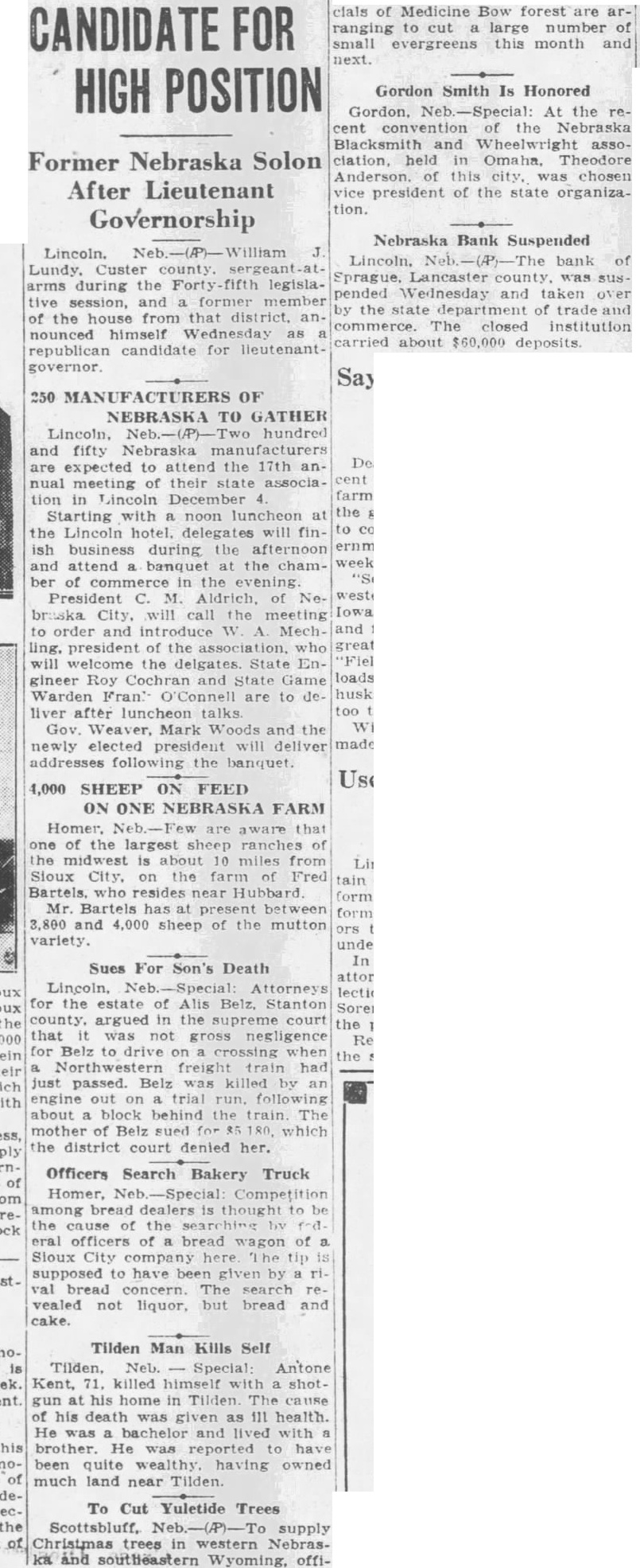 CANDIDATE FOR HIGH POSITION Former Nebraska Solon After Lieutenant Governorship Lundy. Custer county. sergeant-atarms during the Forty-fifth legislative session, and a former member of the house from that district, announced himself Wednesday as republican candidate for lleutenant- 250 MANUFACTURERS OF NEBRASKA TO GATHER and fifty Nebraska manufacturers are expected to attend the 17th annual meeting of their state association in Lincoln December 4. Starting with a noon luncheon at the Lincoln hotel. delegates will finish business during the afternoon and attend a banquet at the chamber of commerce in the evening President C. M. Aldrich, of Nebraska City, will call the meeting to order and introduce W A Mechling. president of the association. who will welcome the delgates. State Engineer Roy Cochran and State Game Warden Fran: O'Connell are to deliver after luncheon talks Gov. Weaver, Mark Woods and the newly elected president will deliver addresses following the banquet. 4,000 SHEEP ON FEED ON ONE NEBRASKA FARM Homer, Neb-Few are aware that one of the largest sheep ranches of the midwest is about 10 miles from Sioux City, on the farm of Fred Bartels. who resides near Hubbard Mr Bartels has at present between 3,800 and 4,000 sheep of the mutton variety. Sues For Son's Death for the estate of Alis Belz, Stanton county. argued in the supreme court that it was not gross negligence for Belz to drive on crossing when Northwestern freight train had just passed. Belz was killed by an engine out on trial run. following about a block behind the train. The mother of Belz sued for 85 180, which the district court denied her. Officers Search Bakery Truck Homer, Neb.-Special Competition among bread dealers is thought to be the cause of the searching by f-d. eral officers of a bread wagon of a. Sloux City company here The tip is supposed to have been given by a rival bread concern. The search revealed not liquor, but bread and cake. Tilden Man Kills Self Tilden. Neb. Special: Antone Kent, 71. killed himself with a shotgun at his home in Tilden The cause of his death was given as ill health. He was a bachelor and lived with a brother. He was reported to have been quite wealthy. having owned much land near Tilden. To Cut Yuletide Trees Christmas trees in western Nebraska and southeastern Wyoming, offi- clais of Medicine Bow forest are arranging to cut a large number of small evergreens this month and next. Gordon Smith Is Honored Gordon. Neb.-Special: At the recent convention the Nebraska Blacksmith and Wheelwright assoclation, held in Omaha, Theodore Anderson. of this city, was chosen vice president of the state organization. Nebraska Bank Suspended Lincoln. Neb.-(P)-The bank of Sprague, Lancaster county. was suspended Wednesday and taken over by the state department of trade and commerce. The closed institution carried about $60,000 deposits.