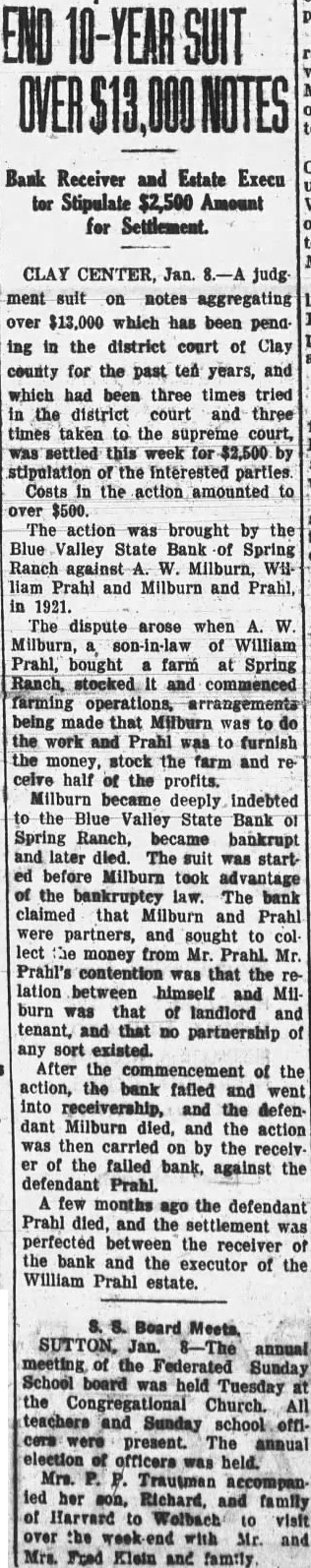 Bank Receiver and Estate Execu tor Stipulate $2,500 Amount for Settlement. CLAY CENTER, Jan. 8.-A judg ment suit on notes aggregating over $13,000 which has been pending in the district court of Clay county for the past ten years, and which had been three times tried in the district court and three times taken to the supreme court, was settled this week for $2,500 by stipulation of the Interested parties Costs in the action amounted to over $500. The action was brought by the Blue Valley State Bank of Spring Ranch against W. Milburn, WH liam Prahl and Milburn and Prahl, in 1921. The dispute arose when A. W Milburn, son-in-law of William Prahl, bought farm at Spring Ranch, stocked and farming operations, being made that Milburn was to do the work and Prahl was to furnish the money stock the farm and rehalf of the profits. Milburn became deeply indebted to the Blue Valley State Bank of Spring Ranch, became bankrupt and later died. The suit was started before Milburn took advantage of the bankruptey law. The bank claimed that Milburn and Prahl were partners, and sought to collect money from Mr. Prahl. Mr. Prahl's contention was that the relation between himself and Milburn was that of landlord and tenant, and that no partnership of any sort existed. After the commencement of the action, the bank failed and went into and the defendant Milburn died, and the action was then carried on by the receiv er of the falled bank, against the defendant few months ago the defendant Prahl died, and the settlement was perfected between the receiver of the bank and the executor of the William Prahl estate. SUTTON, Jan annual meeting of the Federated Sunday School board was held Tuesday at the Congregational Church. All teachers and Sunday school officera were present. The annual election of officers was held. Mrs. P. P. Trautmen ied her son, Richard, and family of Harvard to Wolbach visit over the with and Mrs. Fred Elein and family.