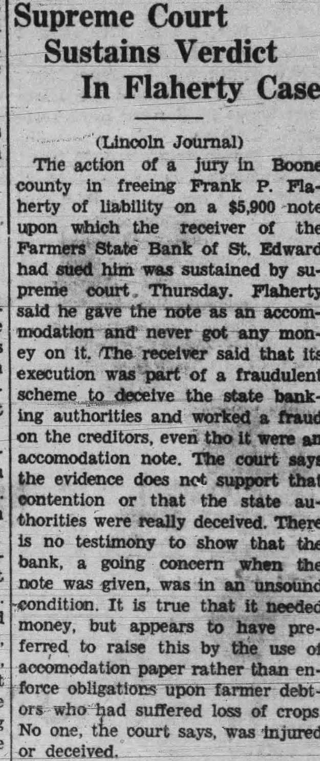 Supreme Court Sustains Verdict In Flaherty Case (Lincoln Journal) The action of jury in Boone county in freeing Frank Flaherty of liability on $5,900 note upon which the receiver of the Farmers State Bank of St. Edward had sued him was sustained by supreme court. Thursday. Flaherty said he gave the note accommodation and never got any money on it. The receiver said that its execution fraudulent scheme to deceive the state banking authorities and worked fraud on the creditors, even the it were accomodation note. The court says the evidence does not support that contention or that the state authorities were really deceived. There no testimony to show that the bank, a going concern when the note was given, was in an unsound condition. It is true that it needed money, but appears to have preferred to raise this by the use of paper rather than enforce obligations upon farmer debtors who suffered loss of crops. No one, the court says, was injured or deceived.