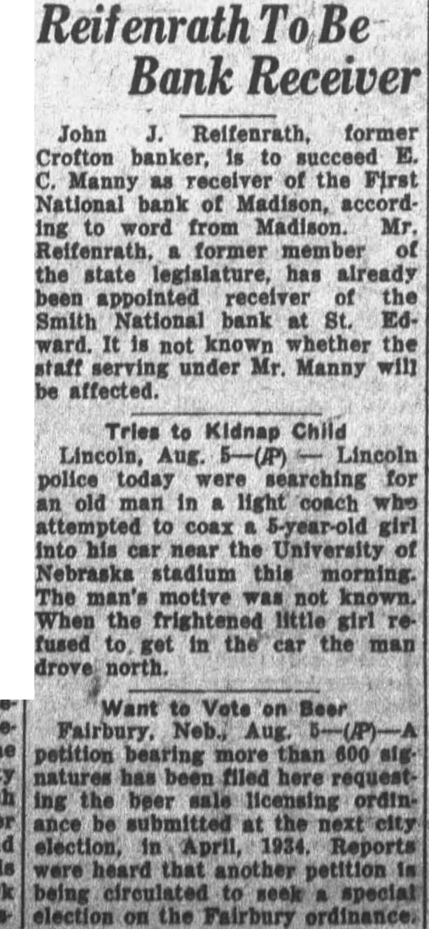 Bank Receiver John former Crofton banker, to Manny as of the First National bank of Madison, accordto word from Madison. Mr. Reifenrath. former member of state legislature, has already been appointed receiver the Smith National bank St. Edward. is not known whether the staff serving under Mr. Manny be affected. Tries to Kidnap Child Lincoln, Aug. Lincoln police today were searching for old man in light coach attempted to coax 5-year-old girl his near the University Nebraska stadium this morning. The man's motive known. the frightened little girl fused in the man Want Vote Beer Neb., Aug. petition bearing more than 600 natures has been filed here ing the beer licensing ordinance be submitted the election, April, 1934. Reports heard that another petition being circulated special election the Fairbury ordinance.