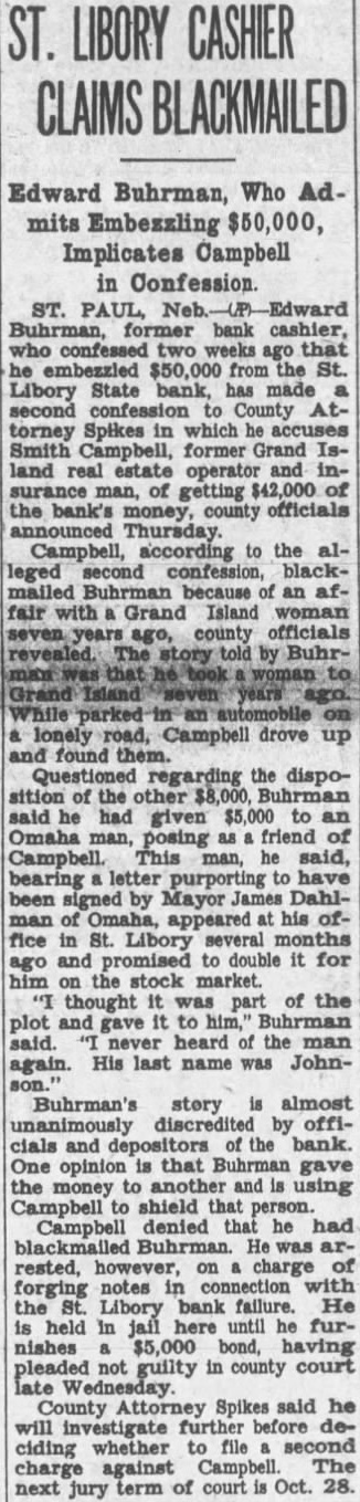 Edward Buhrman, Who Admits Embezzling Implicates Campbell in Confession. ST. PAUL, bank confessed that embezzled from the St. Libory State bank, has made second torney Spikes which Smith former Grand land real operator inof getting the bank's county officials announced Campbell, to the alleged second confession, blackmailed Buhrman because an afwith Grand Island woman officials revealed. Buhrlonely road, Campbell drove found Questioned regarding the disposition of the other said he had given $5,000 to Omaha posing friend of Campbell. said, bearing letter purporting have been signed by Mayor DahlOmaha, appeared his office in Libory months promised double it for stock thought it of the plot and gave to Buhrman never heard the man again. His last name John- Buhrman's story almost by officials and depositors bank. One opinion that gave the money another using Campbell shield that Campbell denied that he had blackmailed was rested, charge forging notes the Libory bank failure. He held in here until he furnishes bond, having pleaded not guilty in county court County Spikes said he will further before deciding whether file second charge against Campbell. The next term of court Oct. 28. jury