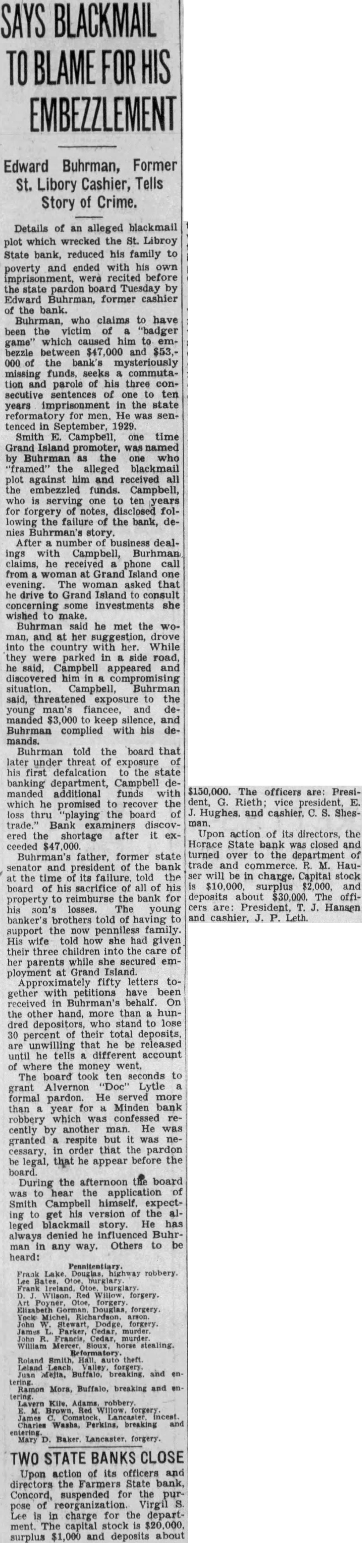 BLACKMAIL BLAME Edward Buhrman, Former Libory Cashier, Tells Story of Crime. Details of an alleged blackmail plot which wrecked the St. Libroy State bank, reduced his family to poverty and ended with his own imprisonment, were recited before the state pardon board Tuesday by Edward Buhrman, former cashier the bank. Buhrman, who claims to have been victim of "badger which caused him to embezzle between and $53,000 bank's mysteriously missing funds, commutation parole of his three consecutive sentences ten years imprisonment in the state reformatory for men. He was senSeptember, Smith E. Campbell, time Grand Island named by Buhrman who alleged blackmail against and received the embezzled funds. Campbell, serving one to ten years for forgery notes, following the failure of the bank, denies story. After dealCampbell, claims, he received phone call from at Island one evening. The woman asked that drive Grand Island to consult concerning some investments she wished make. Buhrman said he met the woand at her drove into the country While they parked in side road, he Campbell and discovered him compromising situation. Campbell, Buhrman said, threatened exposure to the young man's fiancee, and demanded $3,000 keep silence, and Buhrman complied with his demands. Buhrman told the board that under threat exposure his first defalcation the banking department, Campbell demanded additional funds which he promised to recover the "playing the board trade. Bank ered the shortage after it Buhrman's father, former state and of bank the time its failure, told board his sacrifice all of his property to reimburse the bank for losses. The young banker's brothers told of having to support the family. wife how she had given three children the care of her parents while secured employment Grand Island. Approximately letters together petitions have been received Buhrman's behalf. the other hand, more than hundred who stand to lose 30 percent of their total deposits, unwilling that he be released he tells different account where the money went. The board took ten seconds to grant Alvernon "Doc" Lytle formal pardon. He served more than year for Minden bank robbery which confessed cently another man. He was granted respite but was cessary, in order the pardon legal, that he appear before the board. the board During the afternoon to hear application Smith Campbell himself. expecting get his version of the leged blackmail story. He has always denied Buhrany way. Others to be heard: Pennitentiary robbery. Willow, William stealing. Roland and Mora, Buffalo, breaking and Washa, Perkins, Baker forgery. TWO STATE BANKS Upon action of its officers and directors the State bank, Concord, suspended the purof Virgil charge for the department. The capital stock surplus $1,000 and deposits about $150,000. The officers are: PresiRieth; Hughes. and cashier S. Shesaction of its directors, the Horace State was closed and turned the trade and Haucharge. Capital stock surplus $2,000, and deposits about $30,000. The President, Hansen and cashier, Leth.